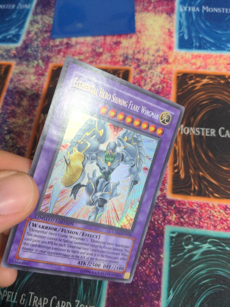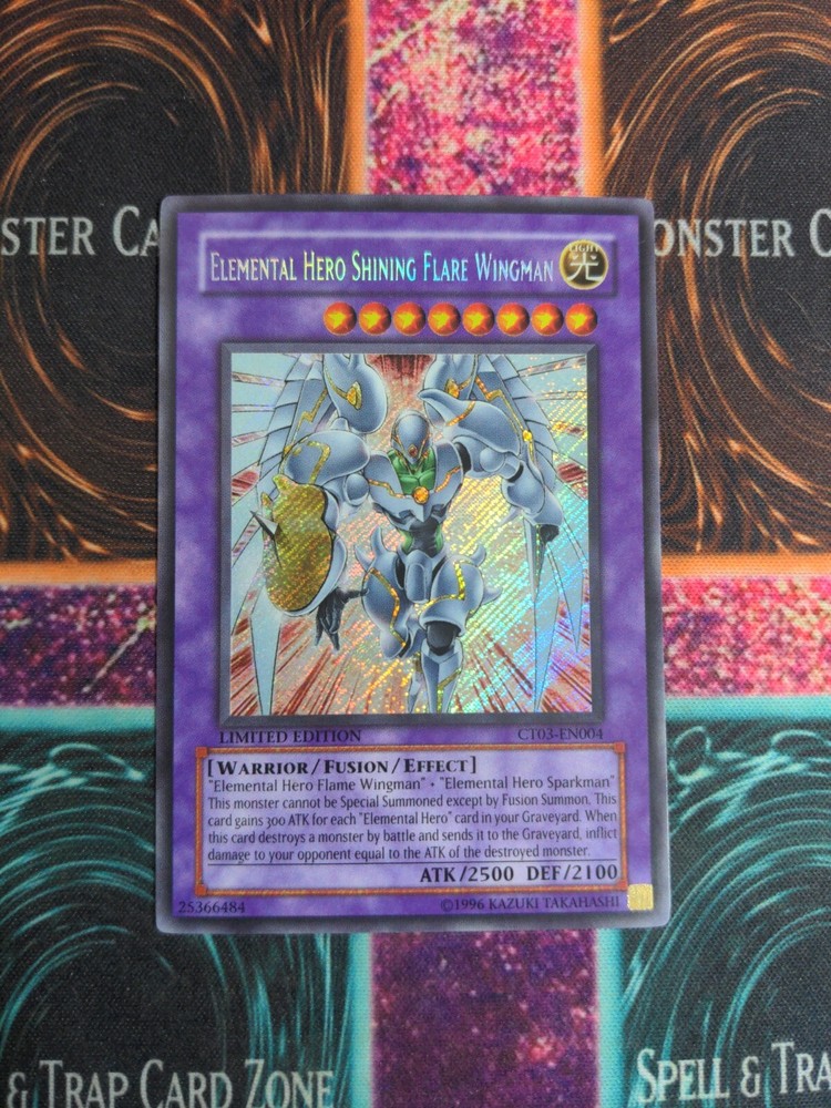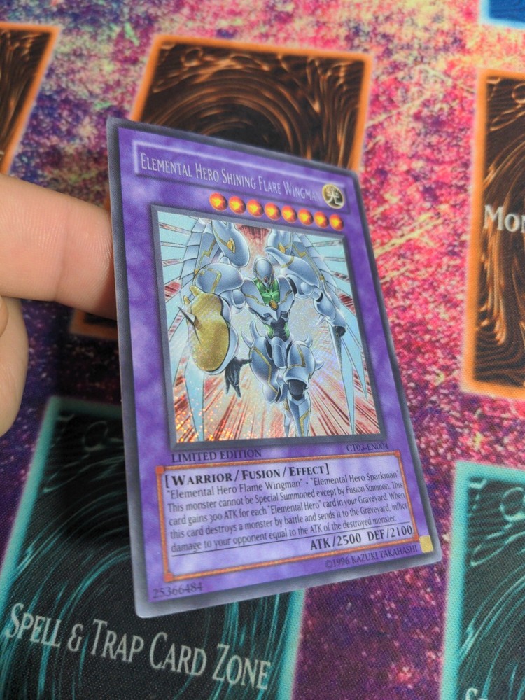 Yu-Gi-Oh! Elemental Hero Shining Flare Wingman CT03-EN004 Limited Secret NM/LP. Slight pressure mark, some sort of print mark on bottom of back
