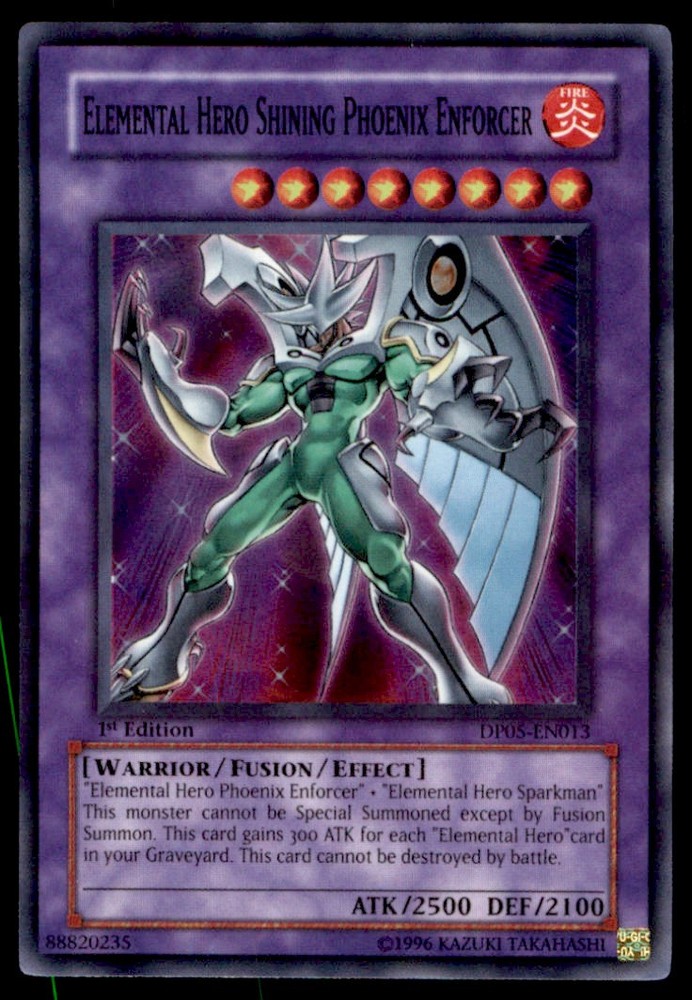 About Me Other Listings Feedback Add to Favorites Contact Me Bluenose Yu-Gi-Oh! Elemental Hero Shining Phoenix Enforcer #DP05-EN013 1st Edition Near No stock photo / These are real scans or pictures Details Description: Elemental Hero Shining Phoenix Enforcer Category: Yugioh Year: 1996 Product: Yu-Gi-Oh! Card Number: DP05-EN013 Special: 1st Edition Near Mint Dimensions: 3¼" x 2¼" SKU: YU B0004 R03 E (31) Payment Payment for buy it now is required immediately and for auctions it must be paid within 72 hours. Shipping Shipments usually make their way out in 1-2 business days. Returns and Claims Please view listing photo and description prior to purchase of card to make sure the card and condition is right for you! About Us Please keep in mind the following conditions .-------------------------------------------Near Mint: a card that shows very little to no signs of ware or usage such as very little whiting. -------------------------------------------Light Play: A card that shows signs of ware such as but not limited to whiting, slight bend or scratches. -------------------------------------------Heavy Play: A card that shows signs of ware, whiting, bending, creasing, folding or other various issues.-------------------------------------------Damaged: a card in very bad condition can have some or all of the above mentioned condition notes including peeling, stains, writing, etc.-------------------------------------------The photo in ads are the EXACT card you will recieve. Listing By Kronocard trading cards software v2.8.2.3