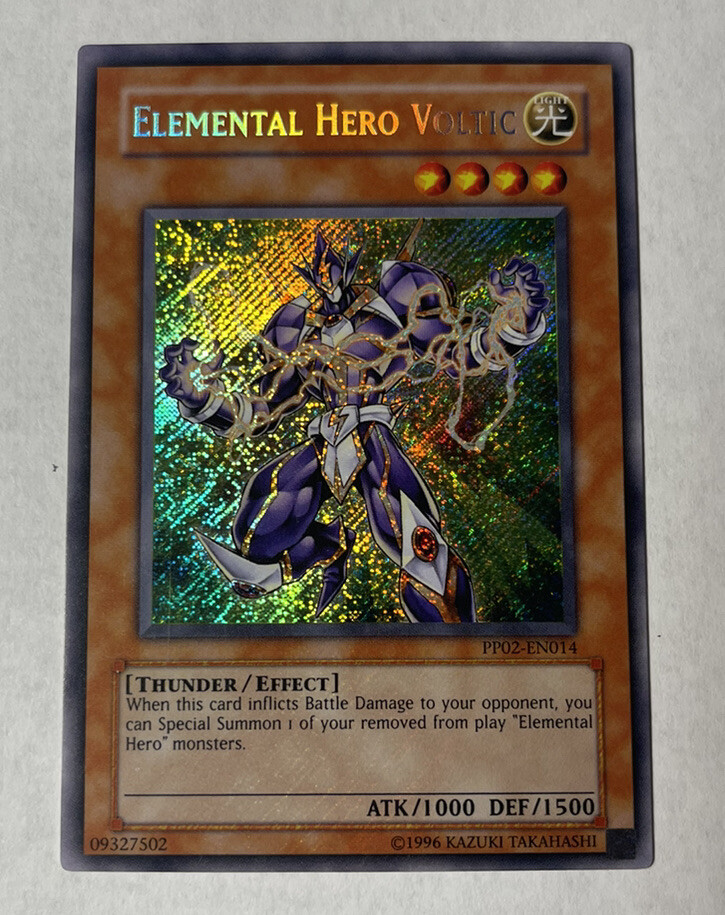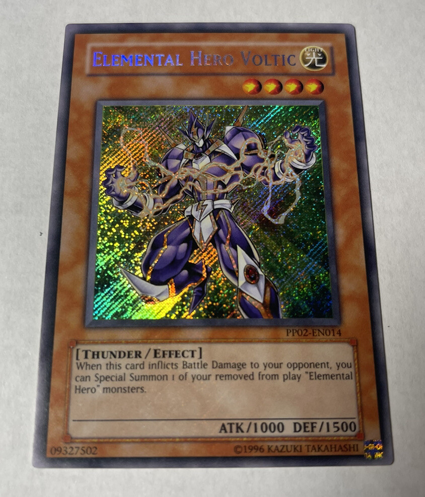 YuGiOh - Elemental Hero Voltic - PP02-EN014 - Secret Rare - Holo Bleed. NM Cards will be shipped in a penny sleeve inserted into a top loader and mailed in a bubble mailer with tracking provided All orders will be shipped same day or following morning at the latest. Any questions feel free to message me Thank you. If You Are Planning On Purchasing Multiple Items Message Me To Combine Shipping. I Also Offer Discounts For Purchases Of Multiple Items. Near Mint to Mint (NM-Mint) = A Near Mint to Mint condition card can range from Near Mint to Mint condition and we would grade most of these cards an 8/10 or 9/10. NM-Mint condition cards may have a few minor imperfections such as nicks on edges or light scratches Lightly Played (LP) = A card in this condition has several imperfections such as nicks, minor scuffing, edge wear, clouding and/or light scratches. Moderately Played (MP) = A card in this condition has noticeable play wear including edge wear, nicks, scratches, clouding, and/or scuffs Heavy Played (HP) = A Heavy Played card is damaged in a way that could make it unplayable in tournaments, even in a sleeve. This damage may include heavy wear, creases, dents, scratches, bends, scuffs, inking, water damage, clouding and/or other types of damage. Damaged (DMG) = A Damaged card is damaged in a way that most likely is unplayable in tournaments, even in a sleeve. This damage may include heavy wear, creases, dents, scratches, bends, scuffs, tears, inking, water damage and/or other types of damage.