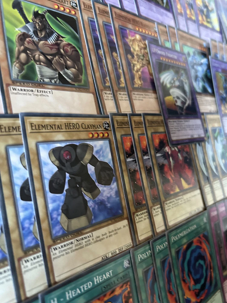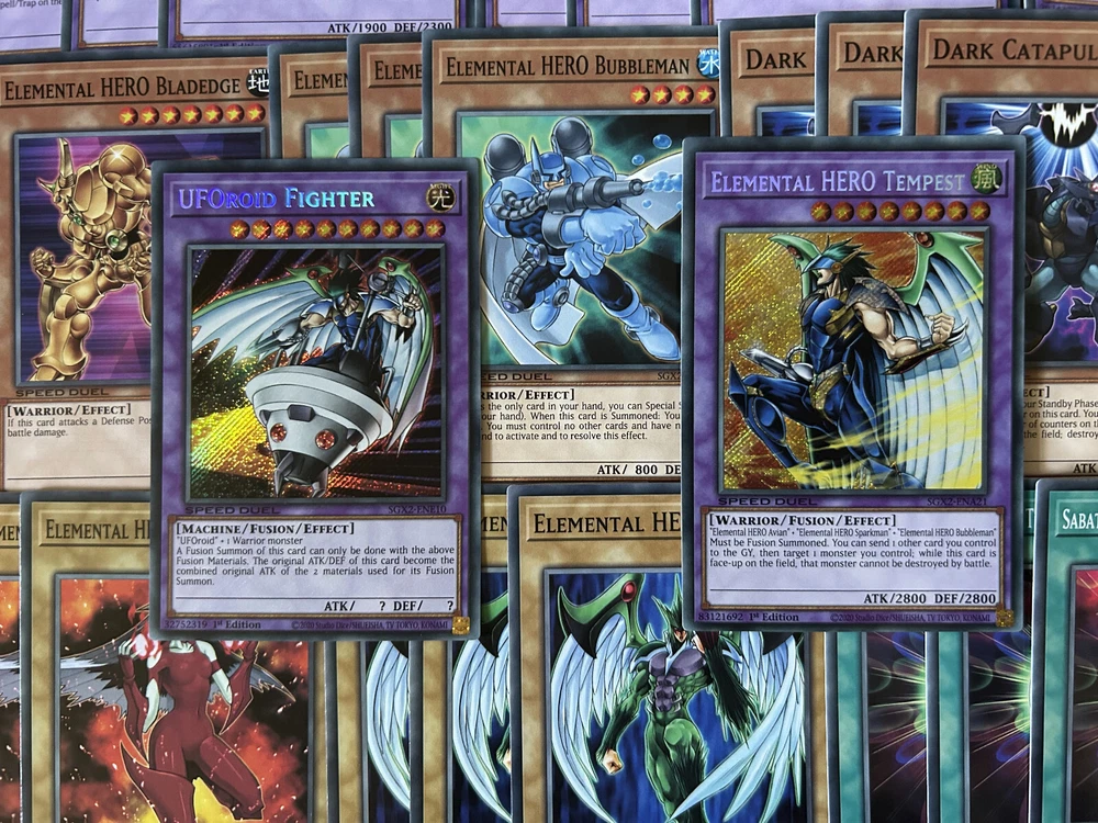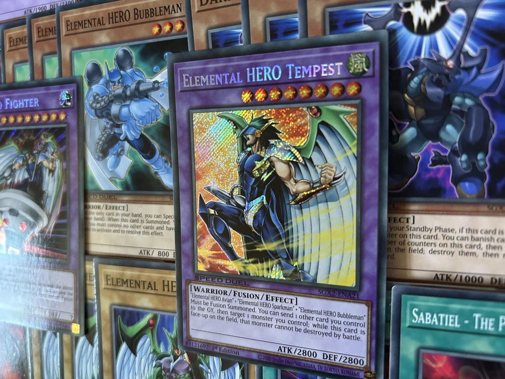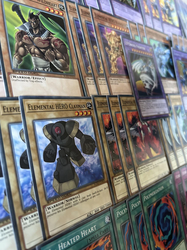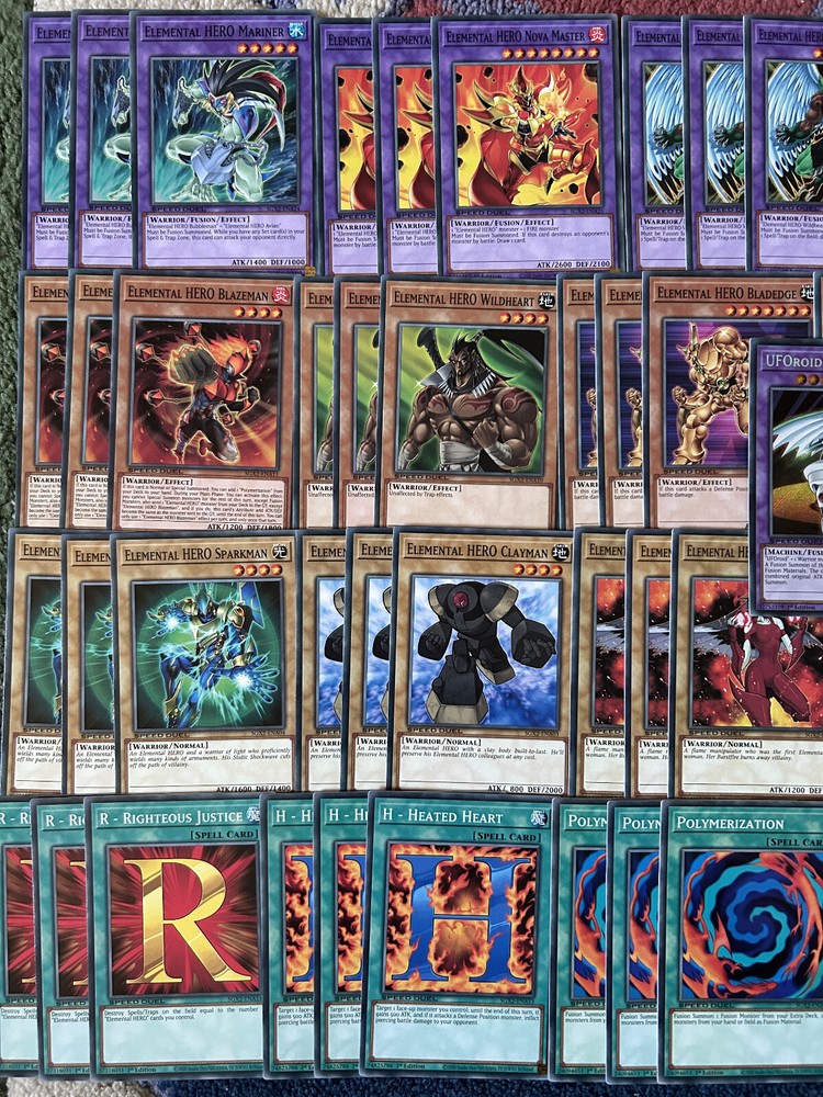 A Yu-Gi-Oh! TCG & SPEED DUEL Jaden Elemental Hero Fusion Deck & Secret Rare Collection , in Mint N/M condition. A Perfect, low cost introduction (or reintroduction!) to the game for any fans of the classic Yu-Gi-Oh Series with a ready to play deck for a local tournament, friendly duels, or SPEED DUELS. You will be delivered a free paper game mat, 2 Jaden Yuki (Elemental Hero) Skill Cards and every card pictured "Elemental HERO Tempest" "Elemental HERO Electrum" "Elemental HERO Wild Wingman" "Elemental HERO Mariner" "Elemental HERO Nova Master" "Elemental HERO Avian" "Elemental HERO Burstinatrix" "Elemental HERO Clayman" "Elemental HERO Sparkman" "Winged Kuriboh" "Elemental HERO Bubbleman" "Elemental HERO Bladedge" "Elemental HERO Wildheart" "Elemental HERO Blazeman" "Polymerization" "H - Heated Heart" "R - Righteous Justice" "Skyscraper 2 - Hero City" "A Hero Lives" "Sabatiel - The Philosopher's Stone" "Hero Signal" "Hero Ring" "Hero Counterattack" This collection will be sent via Royal Mail and will be properly protected. Please check out my other listings and don't hesitate to contact me with any inquiries. Always willing to take further photographs of specific card listings when requested and will work with you to create multiple listing discounts etc.