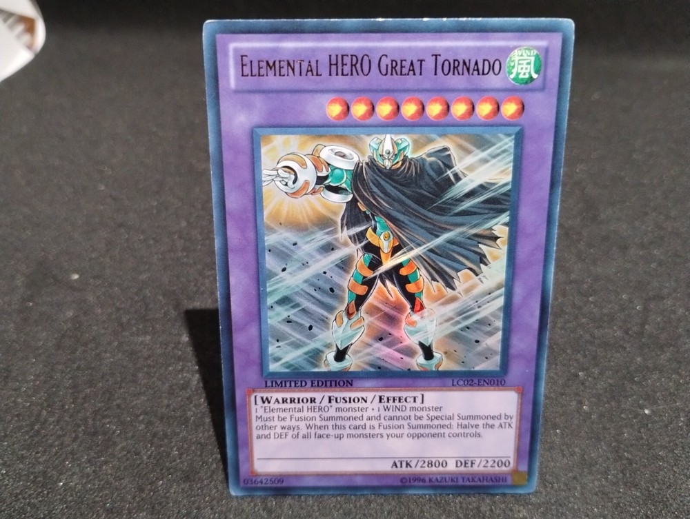 Yu-Gi-Oh! LC02-EN010 Limited Edition Elemental Hero Great Tornado card LP Yu-Gi-Oh! ***We offer Combined Shipping*** CARD CONDITION NM (Near Mint): Card has one or two very small nicks on a edge/corner. SP/LP (Slightly Played-Light play): Card has light whitening on a edge and/or has light play marks. may have a few small scratches on the surface MP (Moderatly Played): Card has sings of wear around the edges and moderate to visible scratches on them. HP (Heavily Played) : Card has been heavily played with . The card is still playable. Will show signs of love DAMAGED : Card went to war and back . Will show signs of damage Ghostly Touch X1 NM Uprising FAB Cold Foil