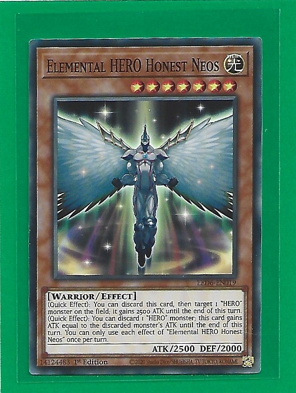 This Yu-Gi-Oh! trading card features the Elemental HERO Honest Neos from the Magical Hero set and is #LED6-EN019. It is in excellent condition and would make a great addition to any collection. Please see photos for your assessment of the condition. This card will be shipped in a pwe with a penny sleeve, card saver or top loader, and a team set bag.