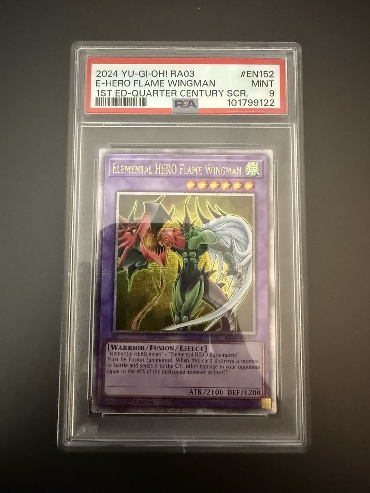 The YuGiOh PSA 9 Mint Elemental HERO Flame Wingman QCR RA03-EN152 1st Ed card is a rare and valuable collectible from the Yu-Gi-Oh! TCG. This Quarter Century Secret Rare card features the Wind attribute and belongs to the Warrior creature type. Manufactured by Konami and graded by Professional Sports Authenticator (PSA), this English-language card is in excellent condition and a prized possession for any collector or player of the game.