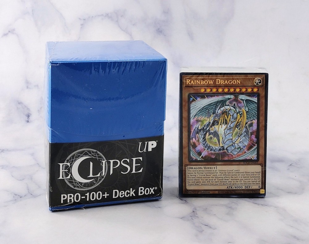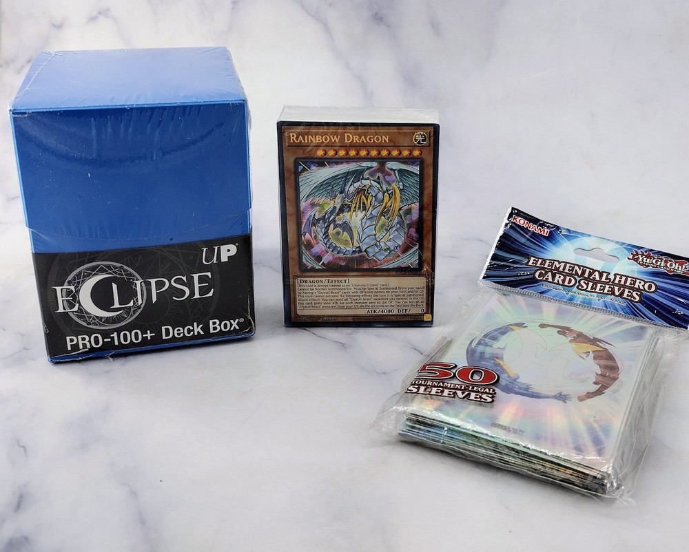 Yu-Gi-Oh Sealed Card Deck W/UP Eclipse Deck Box & Elemental Hero Sleeves See our original photos. Everything is new. Card deck is factory sealed. No idea what box it came out of. Rainbow Dragon Holo on top of the deck. Ultra-Pro Eclipse Pro-100 + Deck Box is factory sealed, with divider. Factory Sealed pack of Elemental Hero Card Sleeves- 50 ct. We ship with USPS. No international shipping. Thanks from Buster's Place-stop by our store for more cards! πΎ