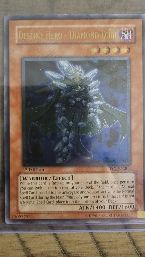 Just pulled this Ultimate Rare Diamond Dude and it’s absolutely stunning! The holo effect pops so beautifully, and the 1st Edition stamp makes it extra special for my Destiny Hero deck. The card arrived in mint condition—perfect for both dueling and collecting. Dark attribute warriors are my favorite, and this EOJ-EN003 gem didn’t disappoint. Highly recommend for any Yu-Gi-Oh! enthusiast!