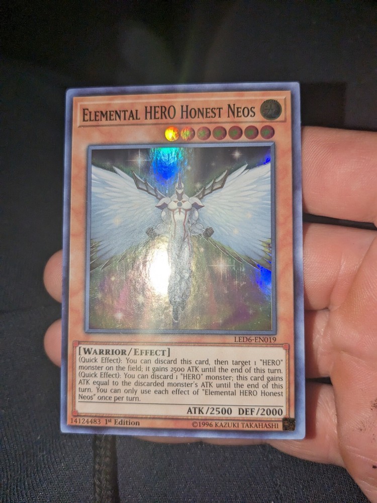 Get ready to add the powerful Elemental HERO Honest Neos card to your Yu-Gi-Oh! TCG collection. This 1st Edition, Super Rare card from the Legendary Duelists: Magical Hero set features an impressive 2500 attack power and 2000 defense toughness, making it a valuable addition to any Warrior-type deck. With its special Effect Card Type, this card can turn the tide of any battle in your favor. Don't miss the chance to own this Near mint or better card, which comes ungraded with Card Number LED6-EN019. Whether you're a seasoned collector or a new player looking to strengthen your deck, the Elemental HERO Honest Neos is a must-have for any Yu-Gi-Oh! fan.