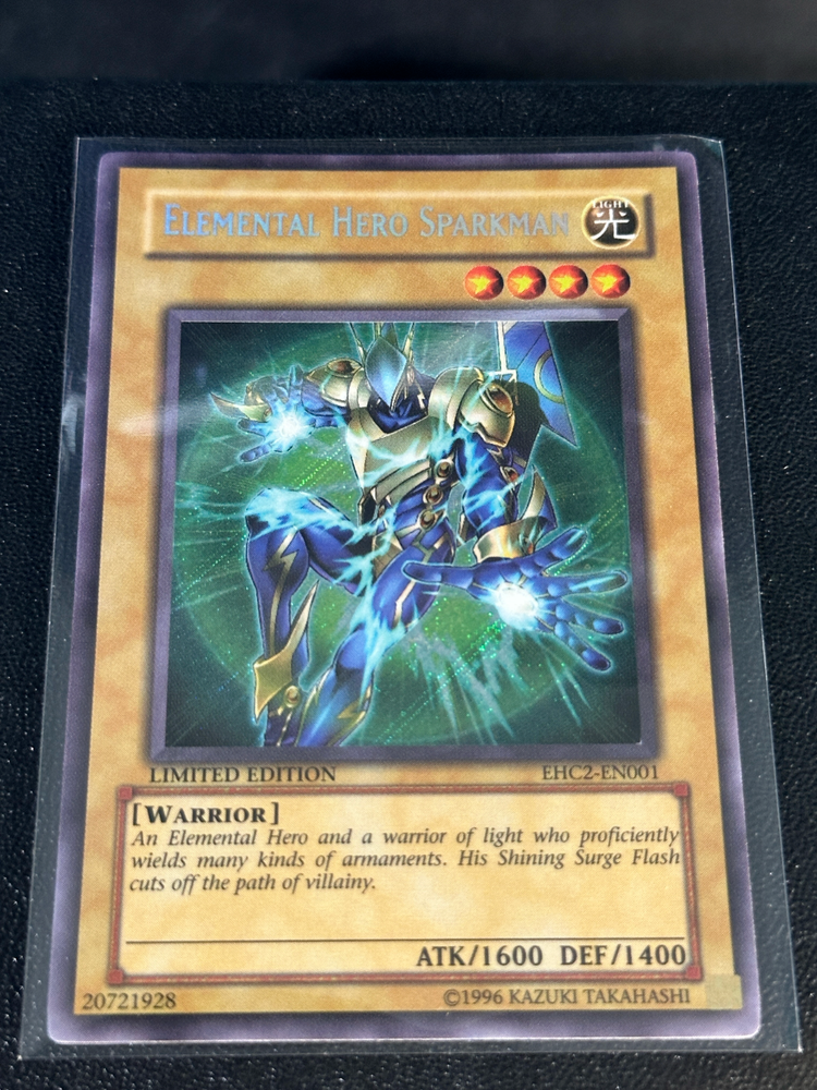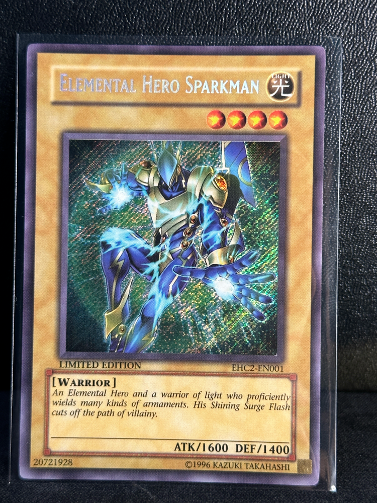 Yu-Gi-Oh! Elemental HERO Sparkman limited edition secret rare card number is EHC2-EN001. Light played Front surface : 8.5 Centering: 10 Back surface : 7 Corners : 7