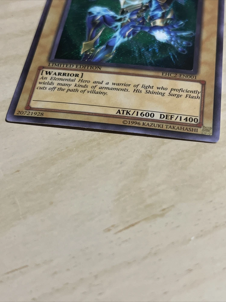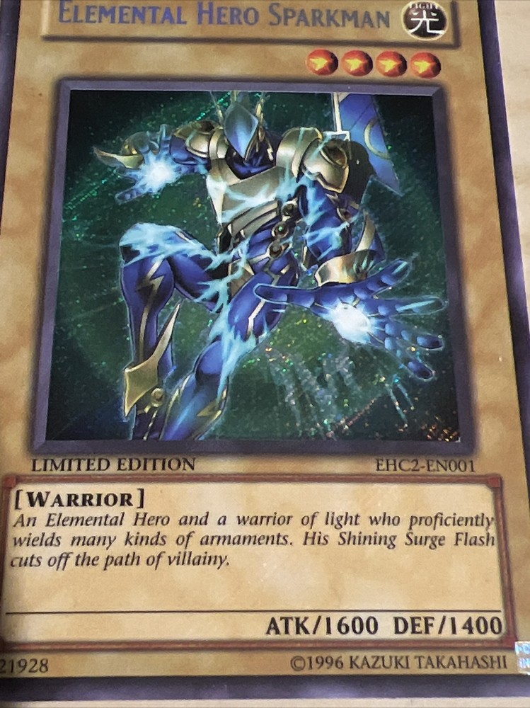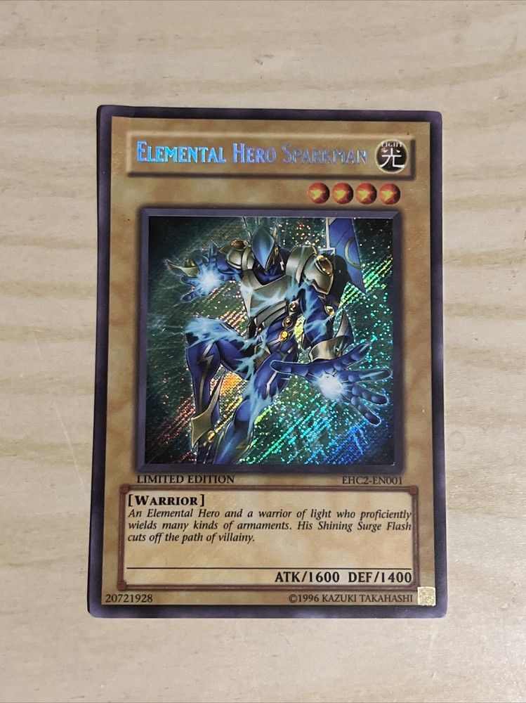 Yu-Gi-Oh TCG: Secret Rare Elemental Hero Sparkman EHC2-EN001, Limited Edition. Overall kept in great condition. No wear, No tears, scrapes or marks on card. Please see pictures - small left hand corner of card is bent. Right hand corner has slight bend. Slight marks on back of card. Will be sent out safely and securely pictures shown is the exact card with accurate angles.