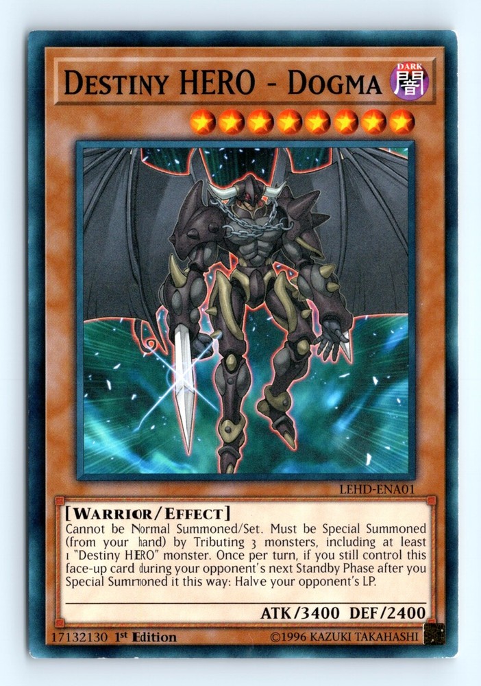 Cards 20$ or Less in Price Will be shipped in a penny sleeve and in a top loader or Semi Rigid card holder by Ebay standard envelope. Please check out the scans for a good look at the condition. This is a example of a Legendary Hero Decks #LEHD-ENA01 Destiny HERO - Dogma Rare . Please check out our other listings for more great cards.