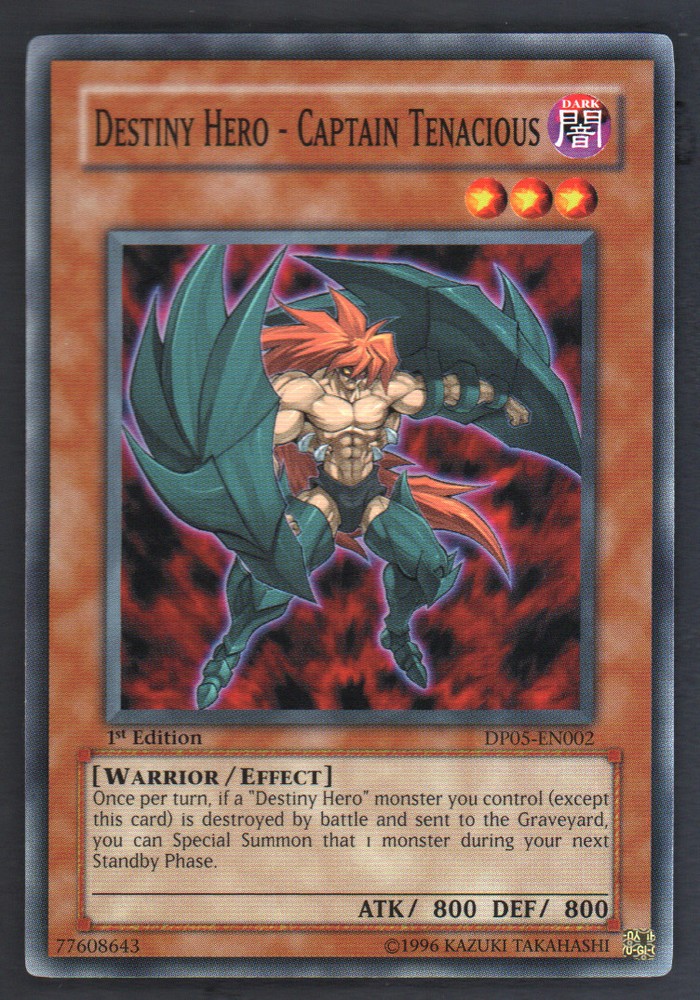 Yu-Gi-Oh Card : Destiny Hero Captain Tenacious - DP05-EN002 - Common - 1st Edition Unplayed : NrMt-Mint Combined Shipping : +$0.25 per extra card, please request an invoice when finished shopping Shipping : Individual cards - Perfect Fit Soft Sleeve, Deck Protector Sleeve, Top Loader and Bubble mailer.