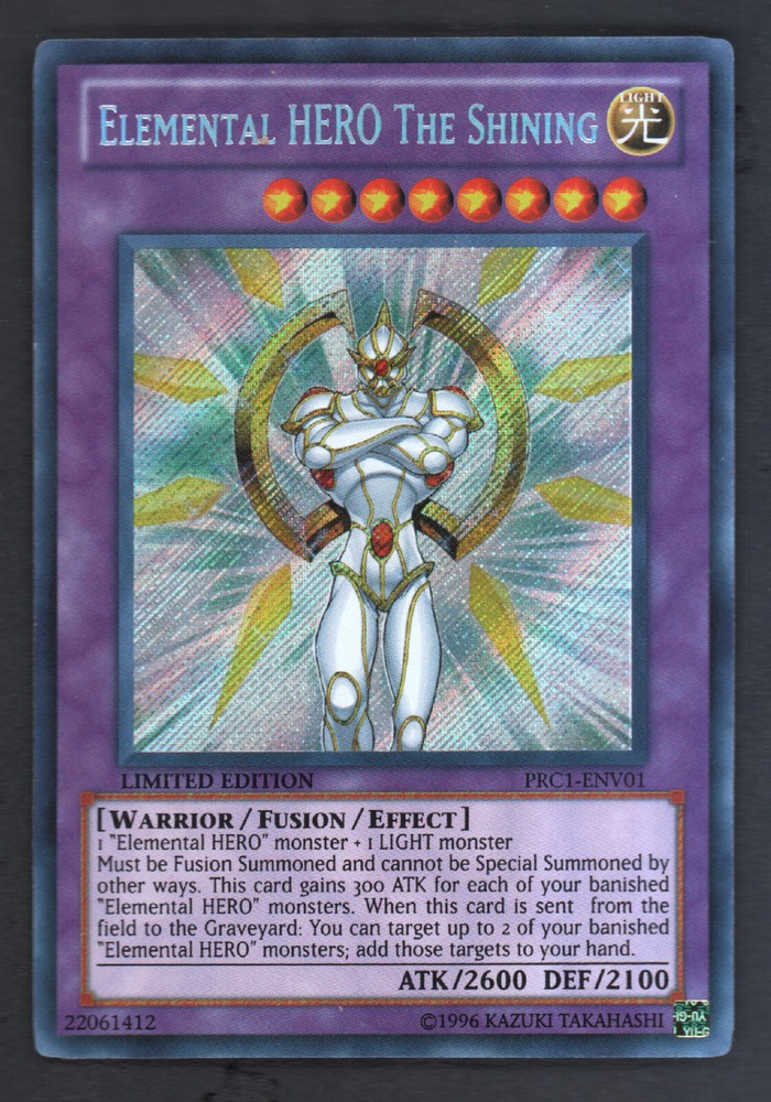 Yu-Gi-Oh Card : Elemental Hero The Shinning - PRC1-ENV01 - Secret Rare Limited Unplayed : Near Mint / Mint Combined Shipping Available Shipping : Individual cards - Perfect Fit Soft Sleeve, Deck Protector Sleeve, Top Loader and Bubble mailer.
