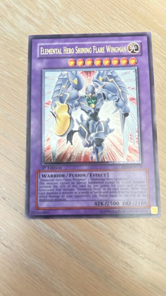 Yugioh 1st Edition ' Elemental Hero Shining Flare Wingman Ultimat Rare-EEN-EN036 READ READ please be sure of your purchase. Card has been kept in a sleeve with top loader. Smoke Free Home Please read entire description & see all pictures before making the purchase. No Low ball offers. Sold As Is This rare and highly sought-after card from the Yu-Gi-Oh! TCG is a must-have for any serious collector. The Elemental HERO Shining Flare Wingman card, with its stunning purple color and warrior creature type, is sure to impress. This card is a standard size and made from high-quality card stock, with a fusion card type and ultimate stage. It was manufactured by Konami in 1996 and is part of the Hidden Arsenal set. This card is an first edition and features the rare EEN-EN036 card number. Don't miss your chance to add this ultimate rare card to your collection.