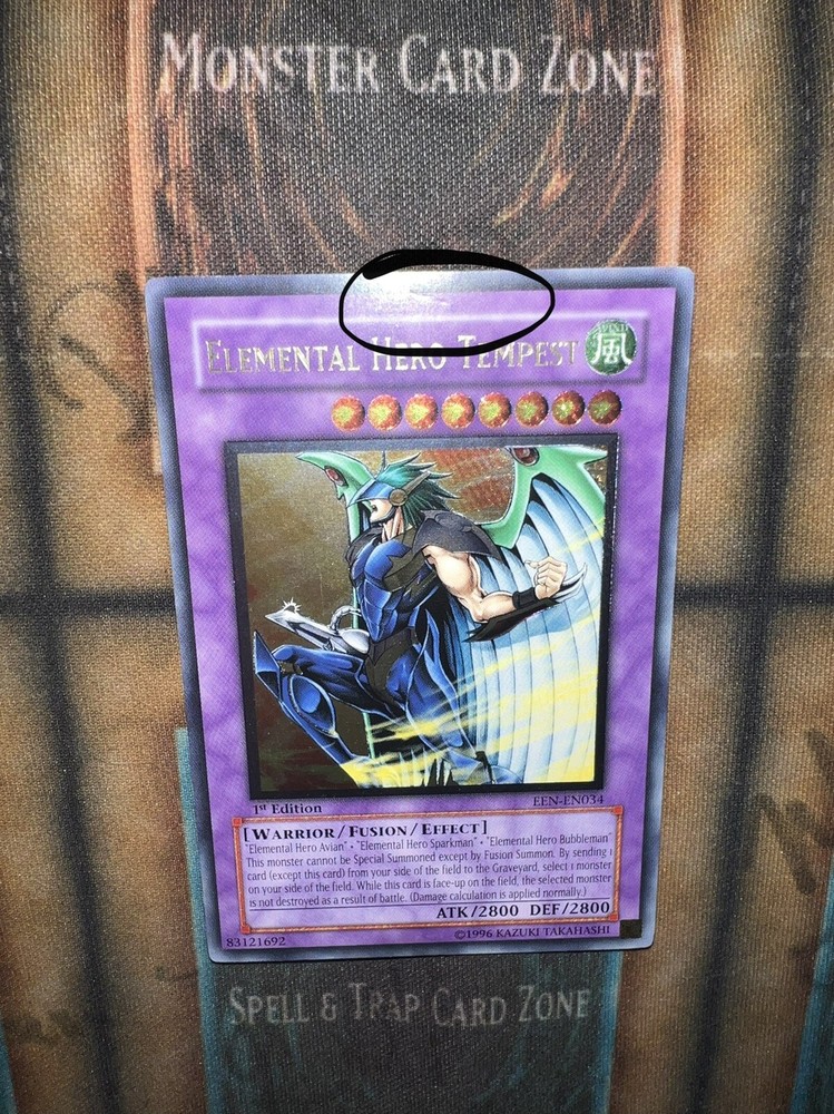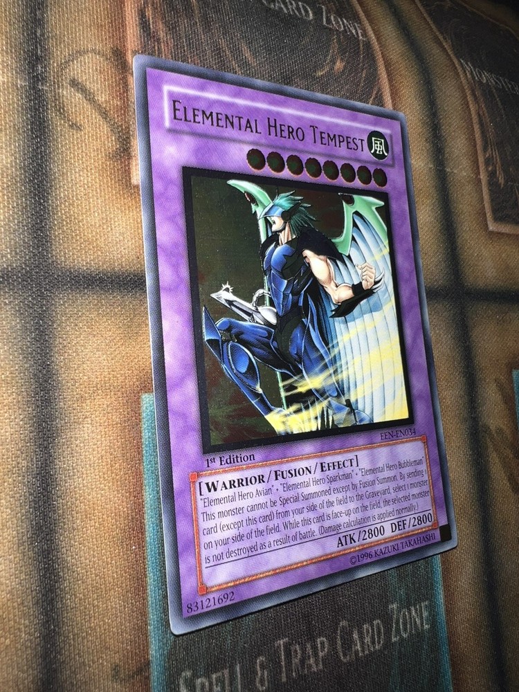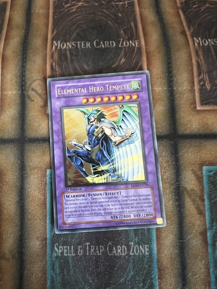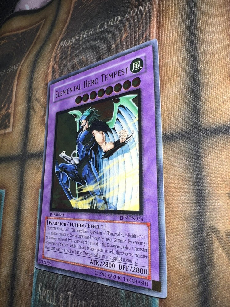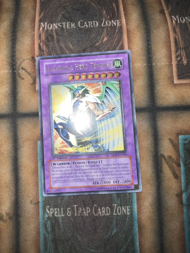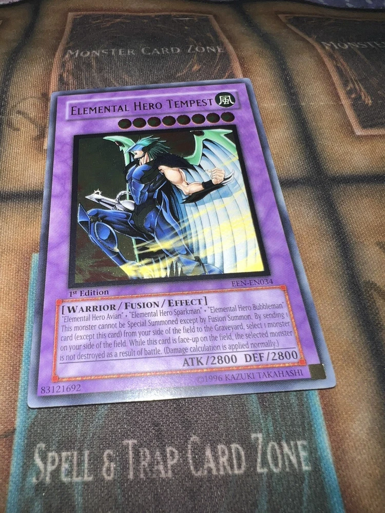 Yugioh 1st Edition Elemental Hero Tempest Ultra Rare EEN-EN034. What you see on the photos it's what you're buying. condition. shown on photos please double check before buying. can provide more photos/videos elemental hero tempest has a small tiny nick on the top of HERO please check it out before purchasing. Not shipping from Friday through Sunday shipping will be from Monday through Thursday. Returns. Only if seller is unhappy with the order and must ship back paying for signature confirmation and tracking. Shipping. Signature confirmation over a Purchase of 50 dollars or more no negotiations for this. Any questions feel free to message me. If you’re outside the country make sure to message me before purchasing to fix the shipping cost.