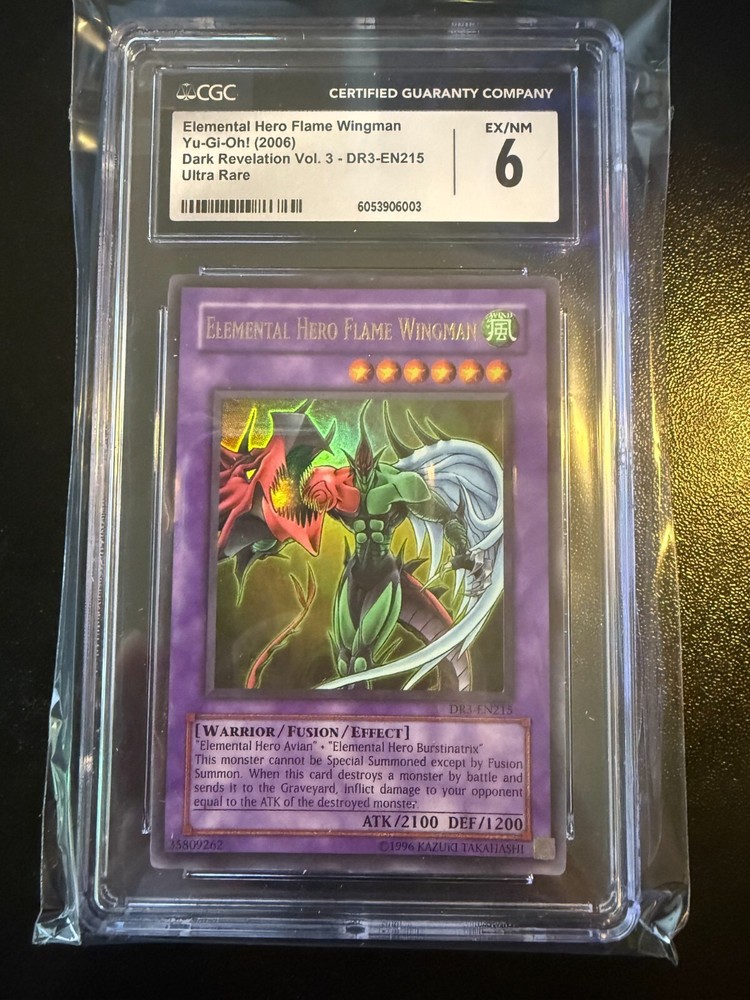 The product is a Yugioh PSA 10 2005 Elemental Hero Flame Wingman card, featuring the character Seto Kaiba and a Flame monster design. Manufactured by Konami in the United States, this English-language card is part of the Yu-Gi-Oh! TCG series and holds the Ultra Rare rarity level. Made of card stock with a holo finish, this Japanese-sized card (DR3-EN215) is a sought-after collectible for fans and collectors of the game. No returns, refunds, or cancellations. All sales are final. Thank you!