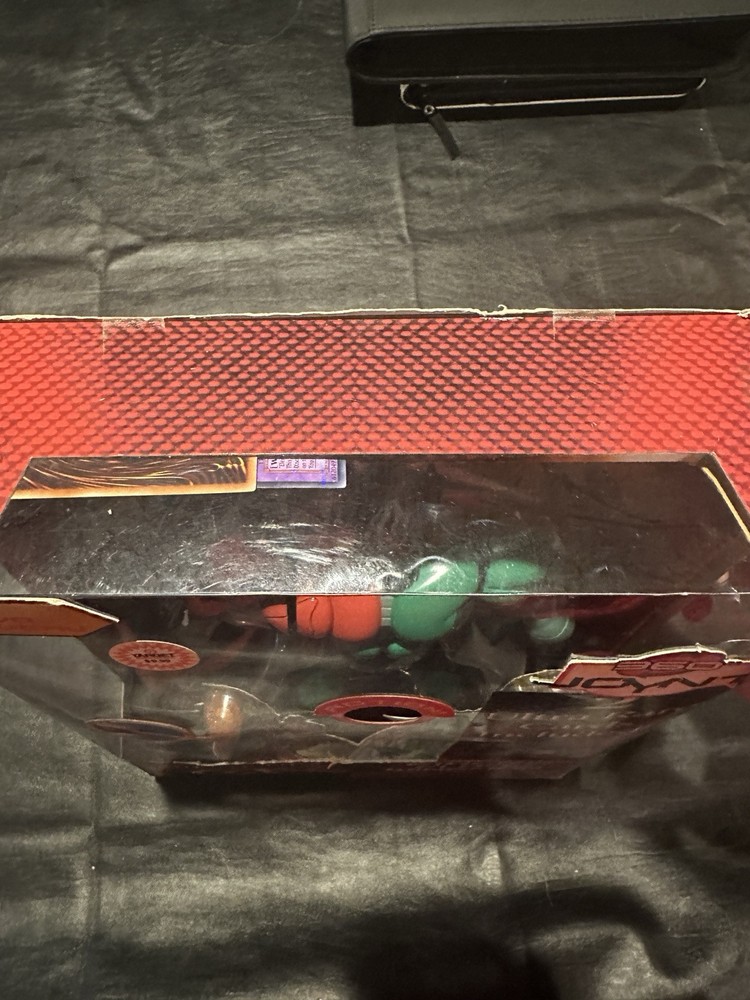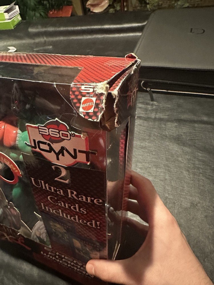 Hello, this is an extremely rare Mattel action figure toy from back in the day. Not to be confused with the other version of this toy that comes without the card, this version was a target exclusive that features 2 of the Mattel promo cards inside. This card is factory sealed, but it does have a bit of damage on the one side as seen in the photos. Feel free to reach out with any questions. Thanks.