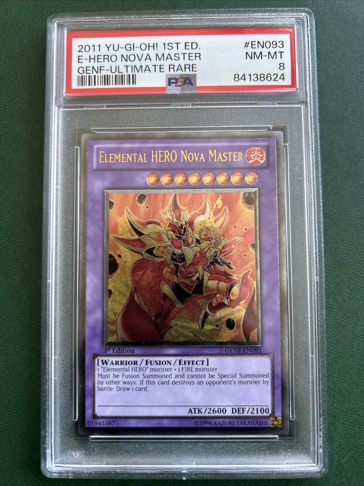 This is a rare and highly sought-after Yugioh card from the 2011 Generation Force set. The Elemental HERO Nova Master card features a stunning holographic finish and is a 1st Edition Ultimate Rare card. It is manufactured by Konami and is written in English language. The card is made of high-quality card stock material and is suitable for ages 6 and up. It is a perfect addition to any Yugioh TCG collection and is a must-have for fans of the fire attribute. The card features the characters Yami Yugi and Yugi Muto and is a warrior creature/monster type. This vintage card is a valuable gem for any collector.
