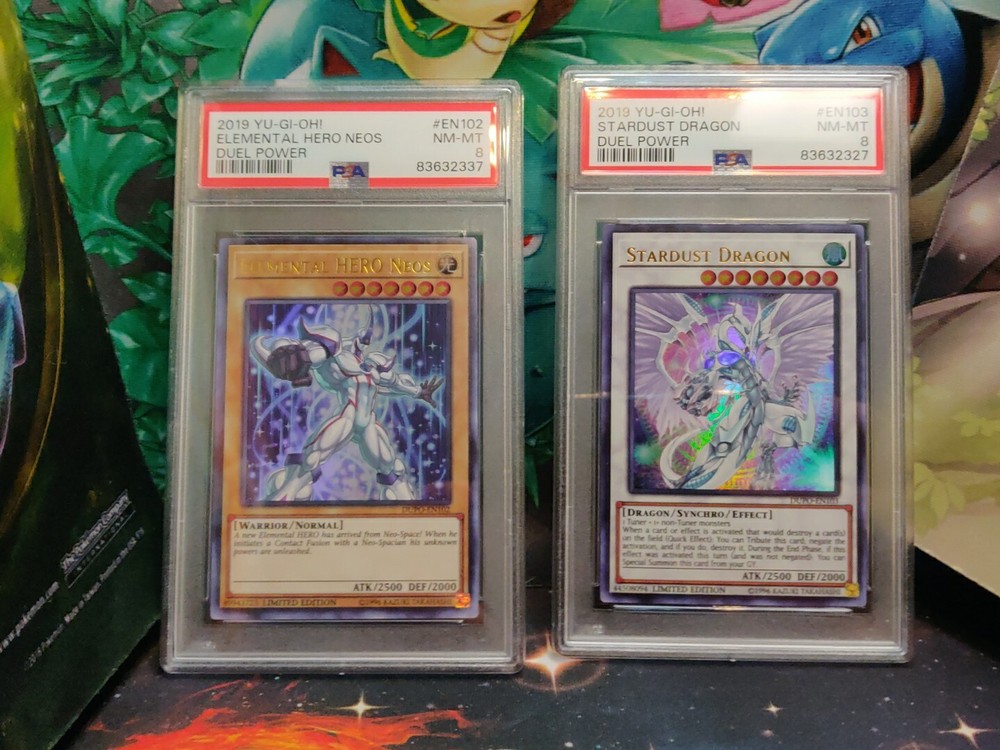 This is a rare and highly sought-after 1st edition Yugioh card featuring Elemental Hero Neos and Stardust Dragon. The card is from the Duel Power set and has a beautiful holo finish, making it a must-have for any serious collector. The card is in excellent condition, graded PSA 8, and is sure to impress both fans of the Yu-Gi-Oh! TCG and collectors alike. With attributes including Darkness, Secret Rare, GX, and English language, this card is a true gem. Don't miss your chance to add this incredible card to your collection.