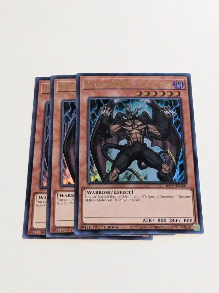 Yugioh! 3x Destiny HERO - Malicious RA03-EN001 Ultra Rare 1st Ed NM. Condition is Ungraded. Shipped with USPS First Class Mail Letter.