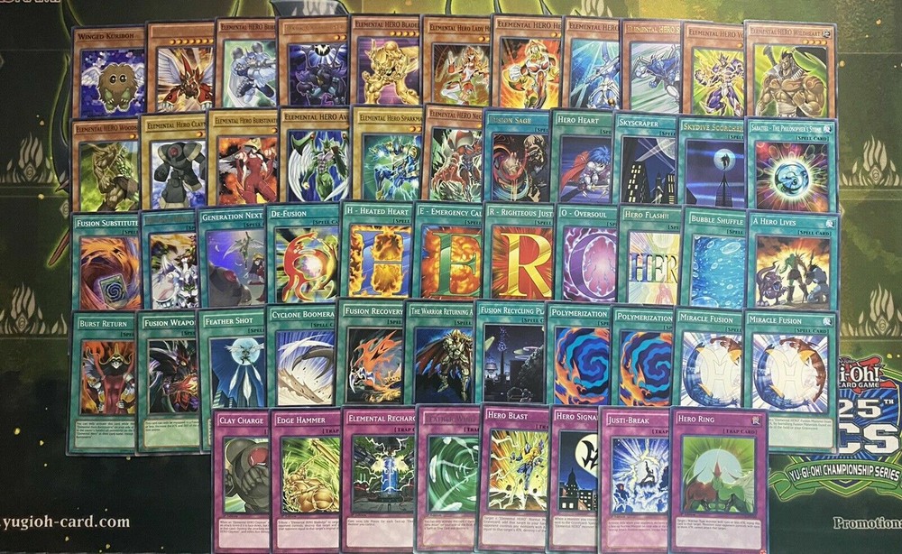 Hey guys I am new to Ebay so give me feedback or ask questions if your unsure about something. Happy Bidding!!! **Picture may have been edited due to Inventory Changes Please read description Below.** Shipping - All orders will be shipped with bubble mailer and a protective case. - I ship to both Domestic (U.S.) and International destinations! Payment - Please pay within 3 days of your order to avoid an Unpaid Item Case. This just helps me run things smoothly for other bidders/buyers and myself. Will appreciate if you please leave feedback when you receive your item, and I will leave feedback as well. Contact me if anything is wrong with your order so I can have a chance to fix the issue- Your satisfaction is most important! Please Allow up to 5-10 Business days before the item will be shipped as I am in grad school and work full time. **If you are a international buyer, Customs Fees are the responsobility of the Buyer** A bonus for ordering you will also Get a Free Holo Card from my collection. It maybe Super Rare, Ultra Rare, or SECRET Rare!!! As a Bonus Gift for buying my auction you will Recieve a Bonus Free Holo Card. It can be Super Rare, Ultra Rare, or Secret Rare or even GHOST Rare!!! You will receive the following items: Monsters: 1| Elemental Hero Necroshade 1| Elemental Hero Bladedge 1| Elemental Hero Wildheart 1| Elemental Hero Woodsman 1| Elemental Hero Bubbleman 1| Elemental Hero Stratos 1| Elemental Hero Heat 1| Elemental Hero Lady Heat 1| Elemental Hero Voltic 1| Elemental Hero Ocean 1| Elemental Hero Sparkman 1| Elemental Hero Clayman 1| Elemental Hero Avian 1| Elemental Hero Burstinatrix 1| Dark Catapulter 1| Winged Kuriboh 1| Winged Kuriboh LV9 Spells: 1| Cyclone Boomerang 1| Feather Shot 1| Bubble Shuffle 1| Fusion Substitute 1| H - Heated Heart 1| E - Emergency Call 1| R - Righteous Justice 1| O - Oversoul 1| Hero Flash!!! 1| Skyscraper 1| Skydive Scorcher 1| Sabatiel - The Philosopher's Stone 1| De-Fusion 1| Generation Next 1| Fusion Recovery 1| Hero Heart 1| Fusion Sage 1| A Hero Lives 1| Fusion Recyling Plant 1| The Warrior Returning Alive 1| Fusion Weapon 1| Burst Return 1| Double Hero Attack 2| Miracle Fusion 2| Polymerization Traps: 1| Clay Charge 1| Edge Hammer 1| Elemental Recharge 1| Feather Wind 1| Hero Blast 1| Hero Ring 1| Hero Signal 1| Justi-Break Extra Deck: 1| Elemental Hero Flame Wingman 1| Elemental Hero Mariner 1| Elemental Hero Great Tornado 1| Elemental Hero Absolute Zero 1| Elemental Hero Gaia 1| Elemental Hero Shining Flare Wingman 1| Elemental Hero Wild Wingman 1| Elemental Hero Necroid Shaman 1| Elemental Hero Infero 1| Elemental Hero Escuridao 1| Xtra Hero Dread Decimator 1| Xtra Hero Wonder Driver