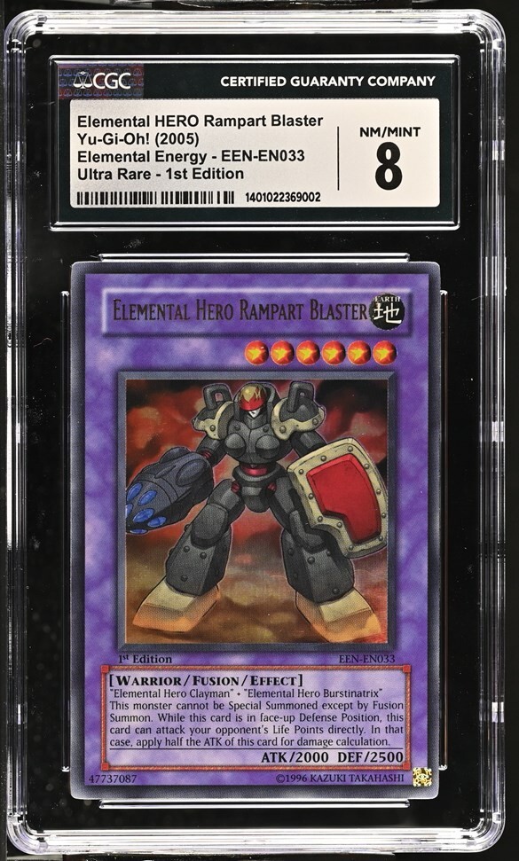 Unleash the power of the Earth with the 'Elemental Hero Rampart Blaster' from the Elemental Energy set. This ultra-rare, first edition card is a must-have for any Yu-Gi-Oh! TCG collector, boasting the prestige of a Certified Guaranty Company (CGC) grade of 8, Near Mint or Better. The card's English language version, produced by Konami in 2005, features a striking Holo finish that accentuates its impressive design. The 'Elemental Hero Rampart Blaster' card is not just a collectible but also a formidable Fusion card that can elevate any player's deck with its unique Earth attribute. Its age level is suitable for anyone aged 8 and above, ensuring it's a fitting addition to both young and seasoned collectors' portfolios. This card is a testament to the rich history of the Yu-Gi-Oh! TCG universe, encapsulating the thrill of the game in a single, ultra-rare piece.