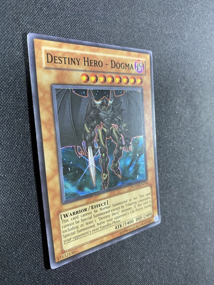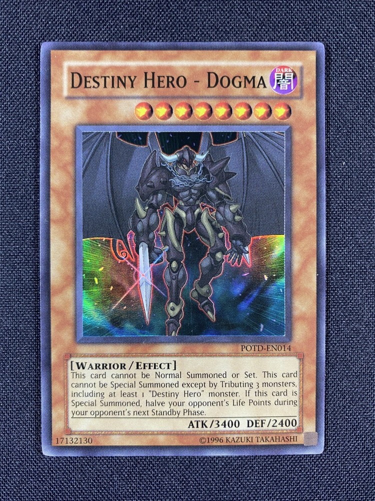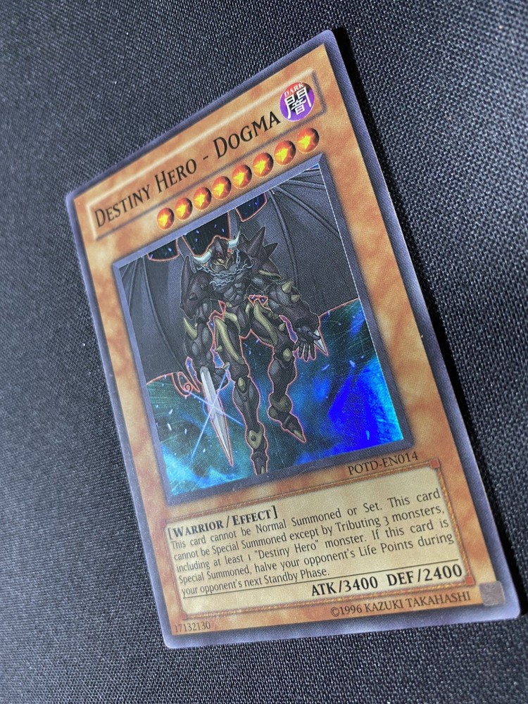 Yugioh Card - Destiny Hero Dogma POTD-EN014 - Unlimited Super Rare Moderately Played. All trading cards kept in sleeves and top loaders....