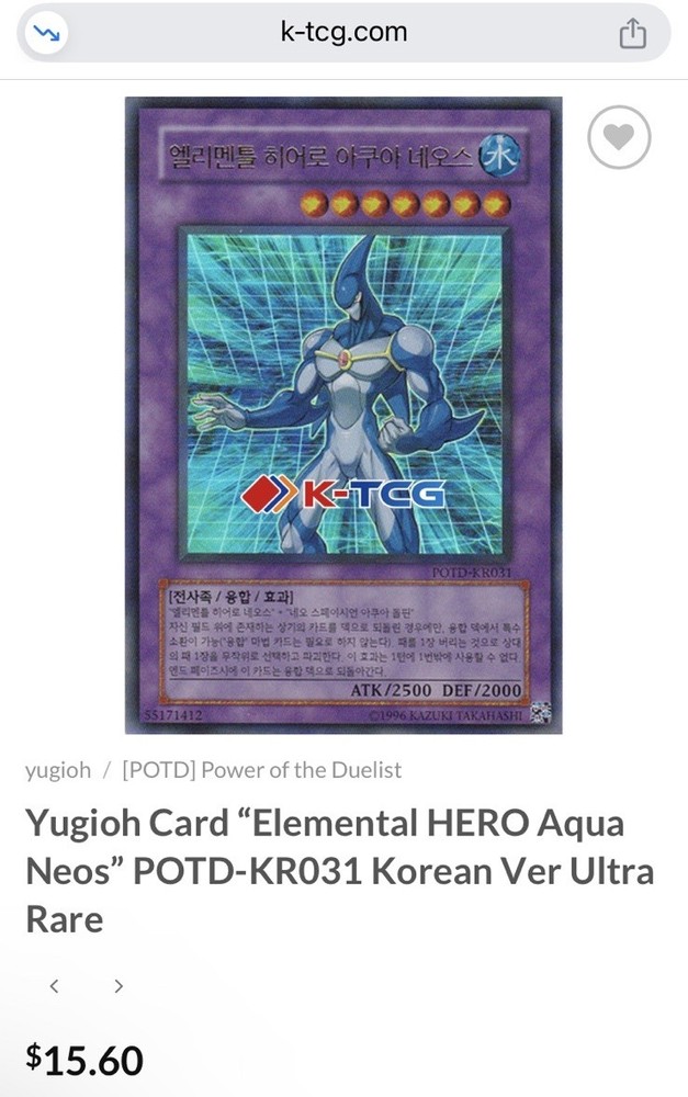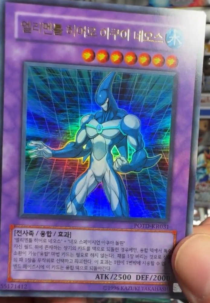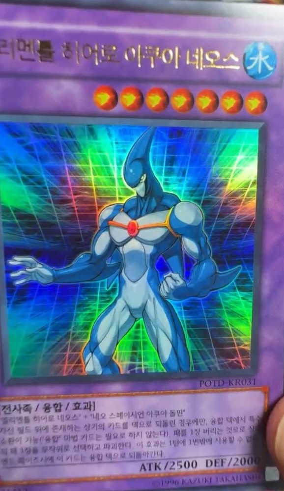 The Yugioh Card "Elemental HERO Aqua Neos" is an ultra rare card from the Korean version of the Yu-Gi-Oh! TCG set "Power of the Duelist". Manufactured by Konami, this standard-sized card features the Korean language and is numbered POTD-KR031. Suitable for ages 8 and up, this collectible card is a sought-after addition for Yugioh collectors and players alike.
