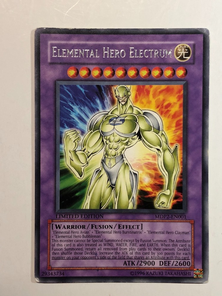 CARD NAME : Yugioh ** Elemental Hero Electrum ** DESCRIPTION : Limited Edition - Rare - MDP2-EN001 CONDITION : Card EX /LP -- Actual card scans (listed) --Please see scans-- CARD FINISH : Rare Silver Name Letters We are not Pro Graders but we try hard to give a close idea of condition. Please check out the scans. Our scans are of Actual card that is listed. -- Please message us if you have any questions!! ****Please check our Feedback to assure a Great Transaction !!!! If you have an issue with your purchase -- Please let us know so we can correct the issue . We love our Positive Feedback and try real hard make all transactions Enjoyable and Quick. Shipping Cost : (unless otherwise noted) -- Cards -- Under $ 20.00 Shipping is .75 cents -- Shipped in heavy duty Kraft envelope -- Cards -- Over $ 20.00 Shipping is 3.50 -- Shipped in bubble mailer. We do combine shipping on multiple items purchased. Please let us know and we will send an invoice to save you $$ on your shipping cost. All shipping is secure and all cards shipped in top loaders and/or card liners. --- Sorry no International Shipping at this time !!