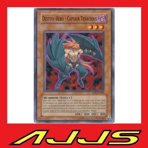YuGiOh DESTINY HERO CAPTAIN TENACIOUS EOJ-EN002 Near Mint $ 1.38 M/NM... Flower Bowl quantity Add To Cart Description Specifics Reviews (1) Description M/NM Specifics Game Yu-Gi-Oh! TCG Graded No Rarity Common Reviews Rated 4 out of 5 Avina4ded037 Good condition. Would buy from again.