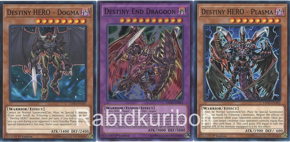 Selling what's listed below. Cards are in near mint or better condition unless specified below. The card(s) edition (1st, unlimited, limited) may be different from what is pictured. If this is important to you, please message me before buying so I can verify. Destiny End Dragoon - DESO-EN013 - Super Rare Destiny HERO - Plasma - LEHD-ENA02 - Common Destiny HERO - Dogma - LEHD-ENA01 - Common Shipping is by USPS. Cards are shipped safely in a top loader.