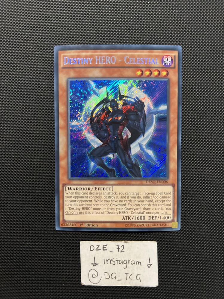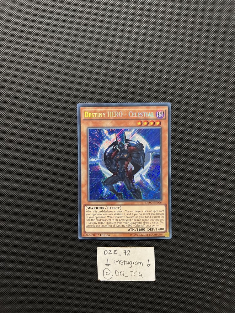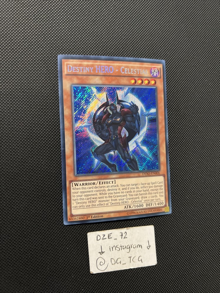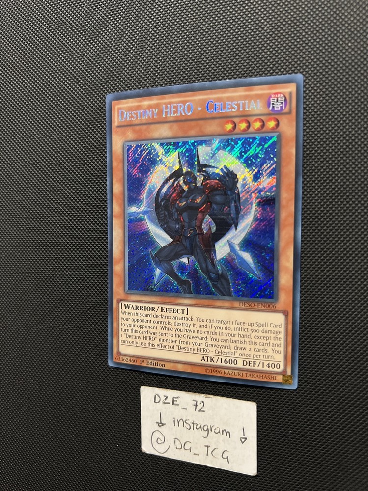 Yugioh - Destiny HERO - Celestial - DESO-EN006- Secret Rare - 1st Edition - NM. Condition - 8.5-9/10 - NM 2 in stock BOTH NM ⚠️COMES WITH NORMAL STANDARD SIZE ENVELOPE + TOP LOADED ⚠️ ⚠️ EXTRA $8,99 IF YOU WANT THE EXTRA PROTECTION + TRACKING & its Cardboard guarded / MAIL PADDED ⚠️ ( I DO COMBINED SHIPPING WITH ALL PURCHASES ) 📦 IF WANTED BULK MSG ME ON INSTAGRAM @DG_TCG 📲 🎉 GIVING BACK MONTH 🎉 BUY 5 + cards GET A SPECIAL GIFT & BUY 10+ cards GET A DOUBLE SPECIAL GIFT 🎉 Comes with sleeve / TOP LOADED ⚠️ Fast & Reliable Check my ebay account for more Yugioh & Pokemon & Football & NBA & UFC CARDS And MORE !!!!! ⚠️ Follow my Instagram for more card steals @dg_tcg ✅✅✅✅✅✅✅✅✅✅