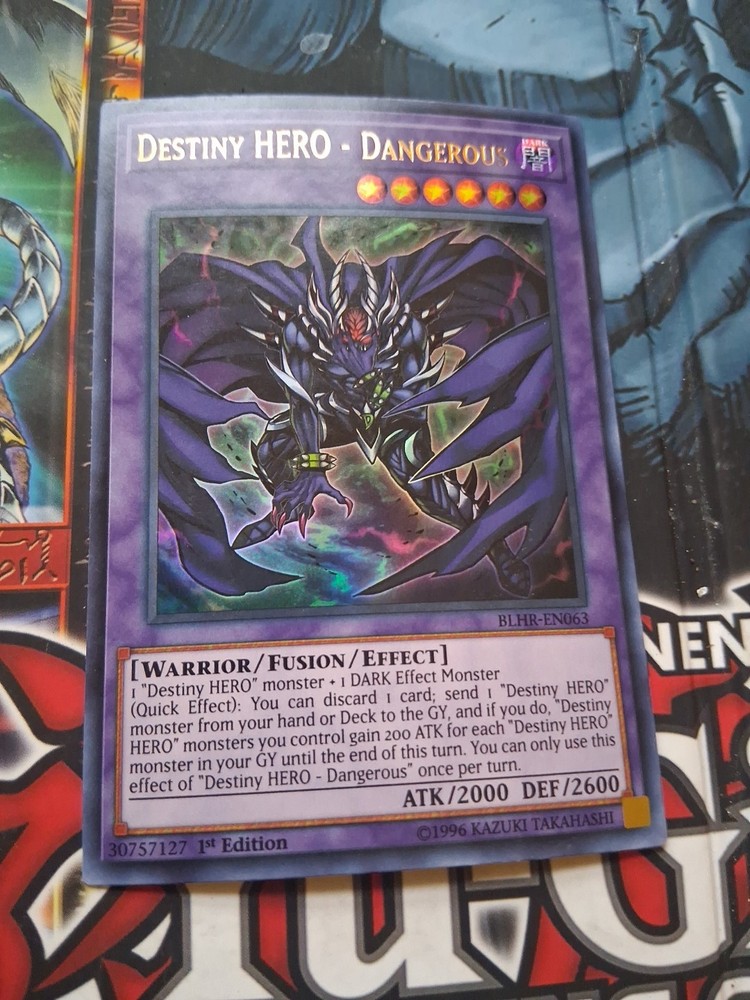 The Yugioh Destiny HERO - Dangerous BLHR-EN063 Ultra Rare 1st Ed NM card is a sought-after collectible in the Yu-Gi-Oh! TCG game. This vintage card from the 2006 set features a unique AlienCon themed design with a Black attribute and Japanese card size. Autographed by 5ban Graphics and authenticated by Beckett Authentication Services, this 1st Edition card is a rare find with a 10000 Secret Rare rarity level. The card's speciality lies in its BREAK effect and features an Angel creature type, making it a desirable addition for collectors and players alike.