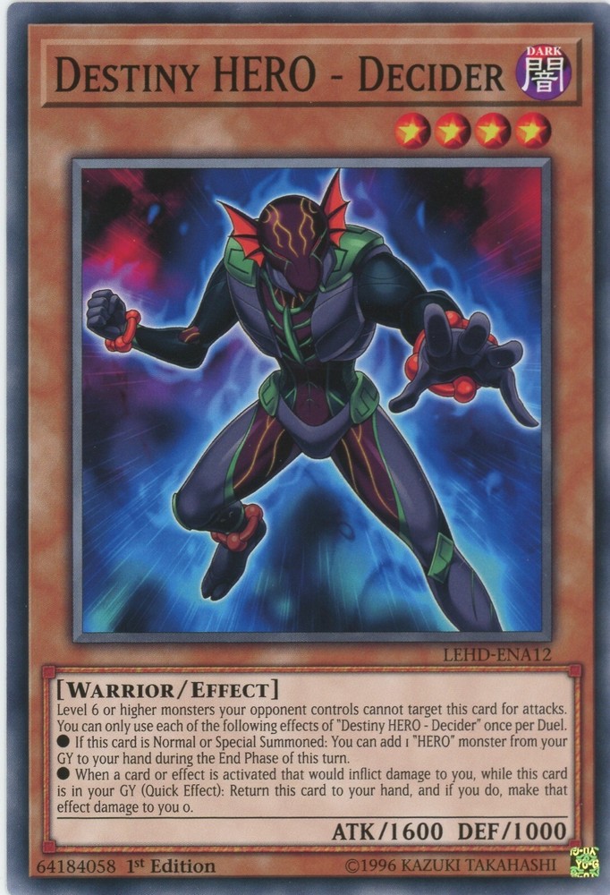 Yugioh Destiny HERO - Decider LEHD-ENA12 Common Mint Condition x3 You can find more Yu-Gi-Oh cards of all value and rarity in our other listings All cards are in excellent condition unless stated otherwise and the photos are of cards we own but may not be the exact card you receive due to the quantities listed.