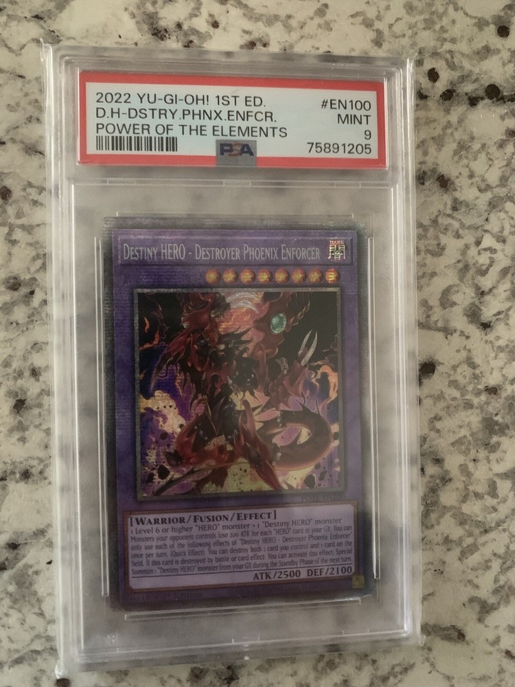 This rare Yu-Gi-Oh! TCG card features the powerful Phoenix hero, known as the Destiny HERO - Destroyer Phoenix Enforcer, with its stunning Starlight design. The card is graded PSA 9 and is a 1st edition Enforcer creation from the manufacturer, making it a valuable addition to any collector's set. The card's character, creature/monster type, card name, and features are all listed in the aspects, making it easy to identify and appreciate. This collectible is perfect for fans of the CCG individual cards and adds value to any Toys & Hobbies or Collectible Card Games collection.