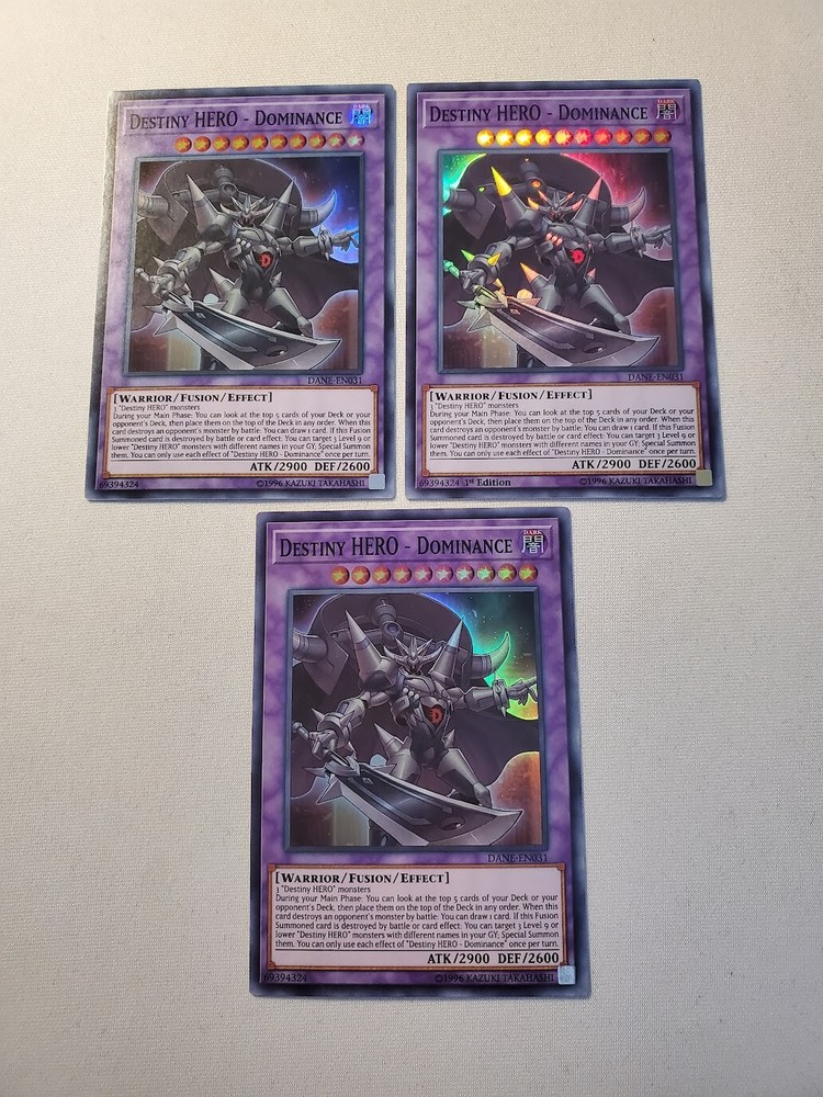 Free eBay listing template designed by dewiso.com Yugioh - Destiny HERO - Dominance DANE-EN031 NM Unlimited/1st ed Super Rare x3 Product This a Yugioh Product that is being sold! Condition is exactly as pointed out in title. For you're reference: NM: Near Mint VLP: Very Lightly Played LP: Lightly Played MP: Moderately Played HP: Heavily Played Shipping This listing will be shipped via card sleeve/penny sleeve and a top loader via letter mail. If you are purchasing an order of over $150 I will provide shipping with tracking free! Contact If you have any questions whether it be more pictures of the back or clarification on an order please contact me! We will do everything to Help! Also if you have multiple items or even have specific things you are looking for, reach out and we might just have it! There are no refunds, items are final sale! If the item has been incorrectly described or wrongly sent, please send images and we will sort it out right away! If the product has X2 or X3, it means it will either come with 2 of the same card or 3 of the same card. Be sure to always check the title of the listing! Great quality products that we ship across North America! Be sure to leave a review when you receive the item! Collection and Bulk Pokemon/Yugioh Purchases If you have any collections or bulk cards that you wish to sell please contact me and send pictures of what you're looking to sell! Rates: Contact me for rates! Reminder: I am looking to make profit when buying and selling, so please when reaching out realize that we both have to profit off the transaction!