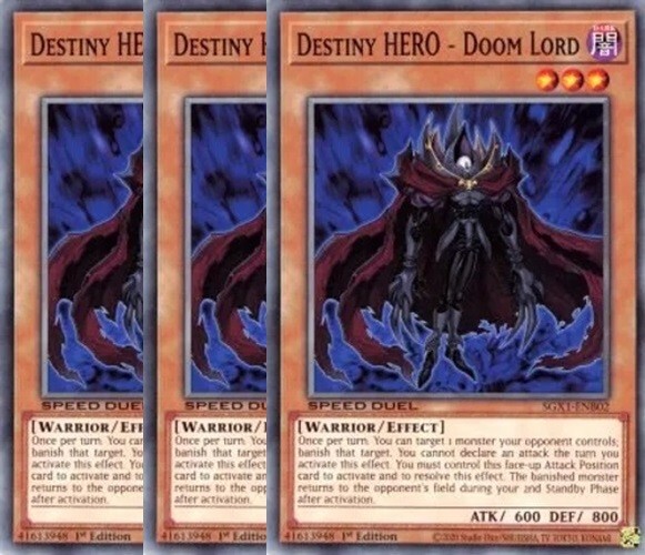 Destiny HERO - Doom Lord x 3 1st Edition The cards are in NM condition. Cards will be placed in a top sleeve and loader for security. Also will include a free Holographic card which can be Super, Ultra, Secret, etc! Card Information SGX1-ENB02 - 1st Edition Speed Duel GX: Duel Academy Box