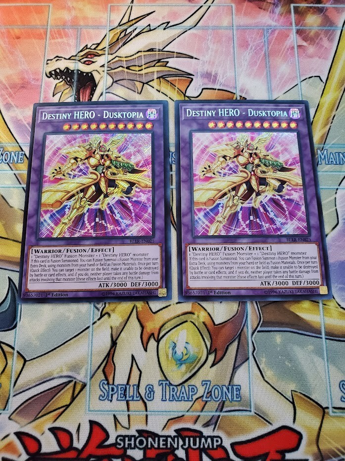 Free eBay listing template designed by dewiso.com Yugioh - Destiny HERO - Dusktopia BLLR-EN025 NM 1st ed Secret Rare x2 Product This a Yugioh Product that is being sold! Condition is exactly as pointed out in title. For you're reference: NM: Near Mint VLP: Very Lightly Played LP: Lightly Played MP: Moderately Played HP: Heavily Played Shipping This listing will be shipped via card sleeve/penny sleeve and a top loader via letter mail. If you are purchasing an order of over $150 I will provide shipping with tracking free! Contact If you have any questions whether it be more pictures of the back or clarification on an order please contact me! We will do everything to Help! Also if you have multiple items or even have specific things you are looking for, reach out and we might just have it! There are no refunds, items are final sale! If the item has been incorrectly described or wrongly sent, please send images and we will sort it out right away! If the product has X2 or X3, it means it will either come with 2 of the same card or 3 of the same card. Be sure to always check the title of the listing! Great quality products that we ship across North America! Be sure to leave a review when you receive the item! Collection and Bulk Pokemon/Yugioh Purchases If you have any collections or bulk cards that you wish to sell please contact me and send pictures of what you're looking to sell! Rates: Contact me for rates! Reminder: I am looking to make profit when buying and selling, so please when reaching out realize that we both have to profit off the transaction!