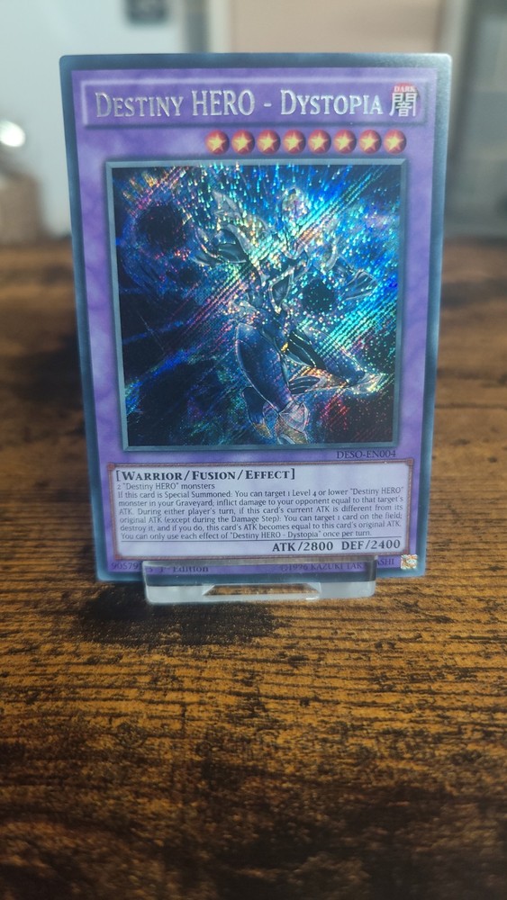 Elevate your Yu-Gi-Oh! TCG collection with the illustrious Destiny HERO - Dystopia card, a Secret Rare fusion from the DESO-EN004 series. With its stunning foil finish, this card is a must-have for enthusiasts and serious collectors alike. The card features the powerful Warrior creature/monster type and comes in English, ensuring it can be seamlessly integrated into your existing deck. Destiny HERO - Dystopia is a 1st Edition piece, adding a touch of exclusivity to your collection. Although its year of manufacture is unspecified, the card's vintage status enhances its appeal. It's crafted from durable aluminium material and bears the signature of its autographed heroes, making it a true gem for any Yu-Gi-Oh! TCG fan.