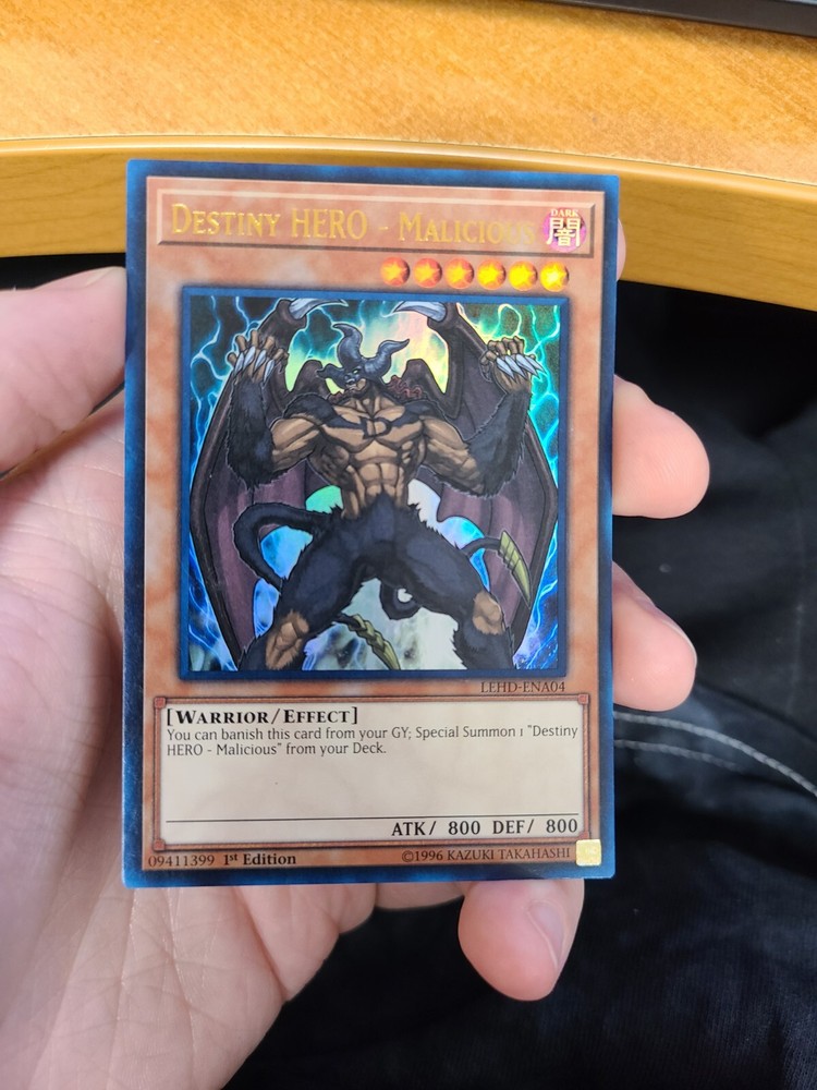 This Yugioh Destiny HERO - Malicious LEHD-ENA04 1st Ultra Rare is a fantastic addition to any collector’s deck! The card arrived exactly as pictured, in perfect condition, and was packaged with great care—sleeved, top-loaded, and securely taped. Free shipping is a huge plus, and orders over $10 get extra protection. Seller communication is excellent, offering more pics if needed. Highly recommend for serious duelists and collectors!