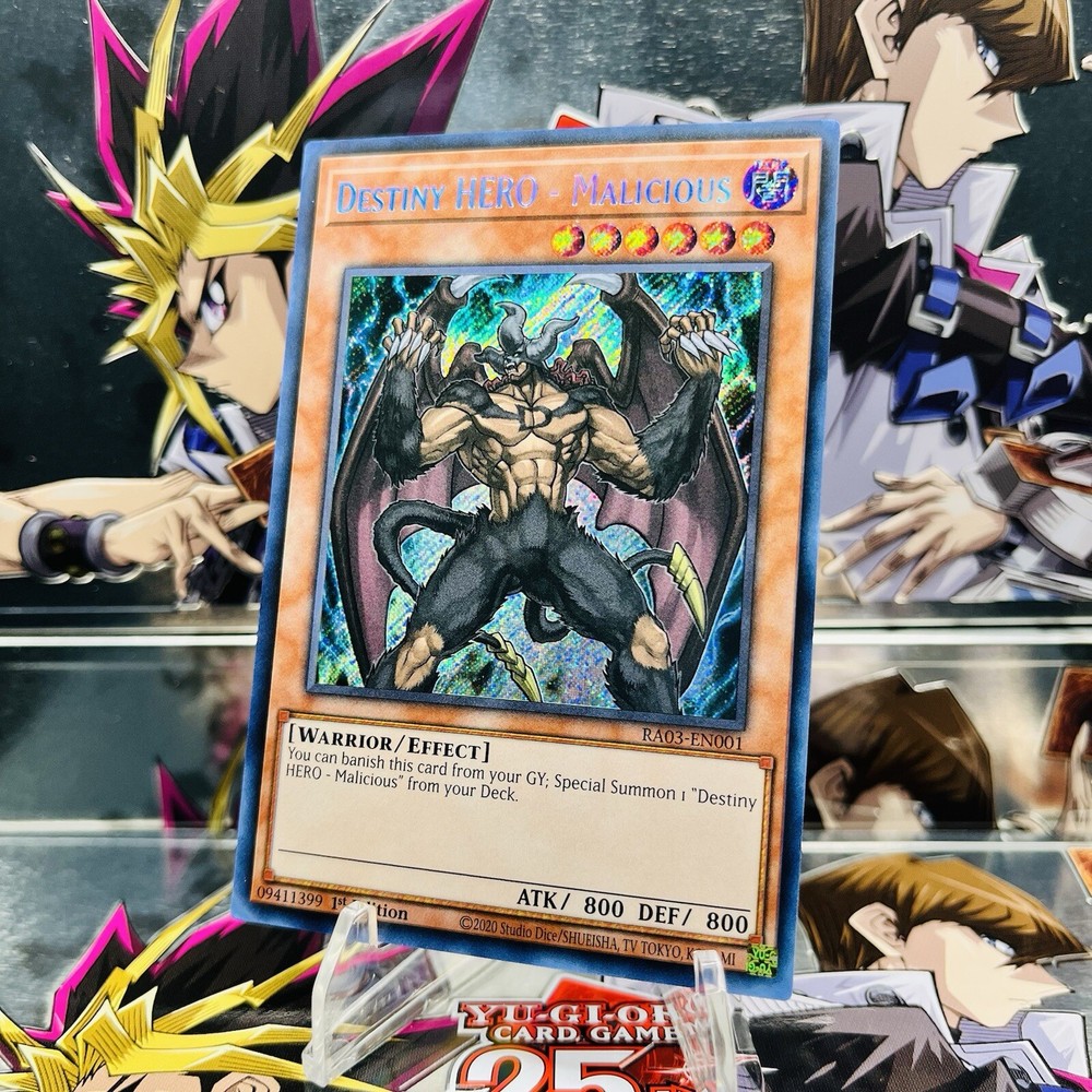 *All orders are packaged and shipped within 24 hours of payment. *All cards are pack fresh. Never played. Never used. *All cards are shipped in top loaders, penny sleeves, and team bags. All guaranteed! Or your money back! You are purchasing 1x authentic Yugioh Destiny HERO - Malicious RA03-EN001 Secret Rare 1st Ed in Near Mint condition. What to Expect: Fast Shipping: All orders are shipped within 24 hours of completed payment. Top Tier Quality: All cards are pulled straight from packs and immediately sleeved (Near Mint with no visible creases, dents, or scratches). Secure Packaging: All orders are tracked and packaged with Top Loaders, Penny Sleeves, and Team Bags for maximum protection. Returns: I accept returns within 30 days if the card arrives in a condition other than described. Buyer pays return shipping. Please, if you have any questions, comments, or concerns, reach out and I will be happy to assist you! Good luck with your deck/collection! Take care, Forbidden One YGO
