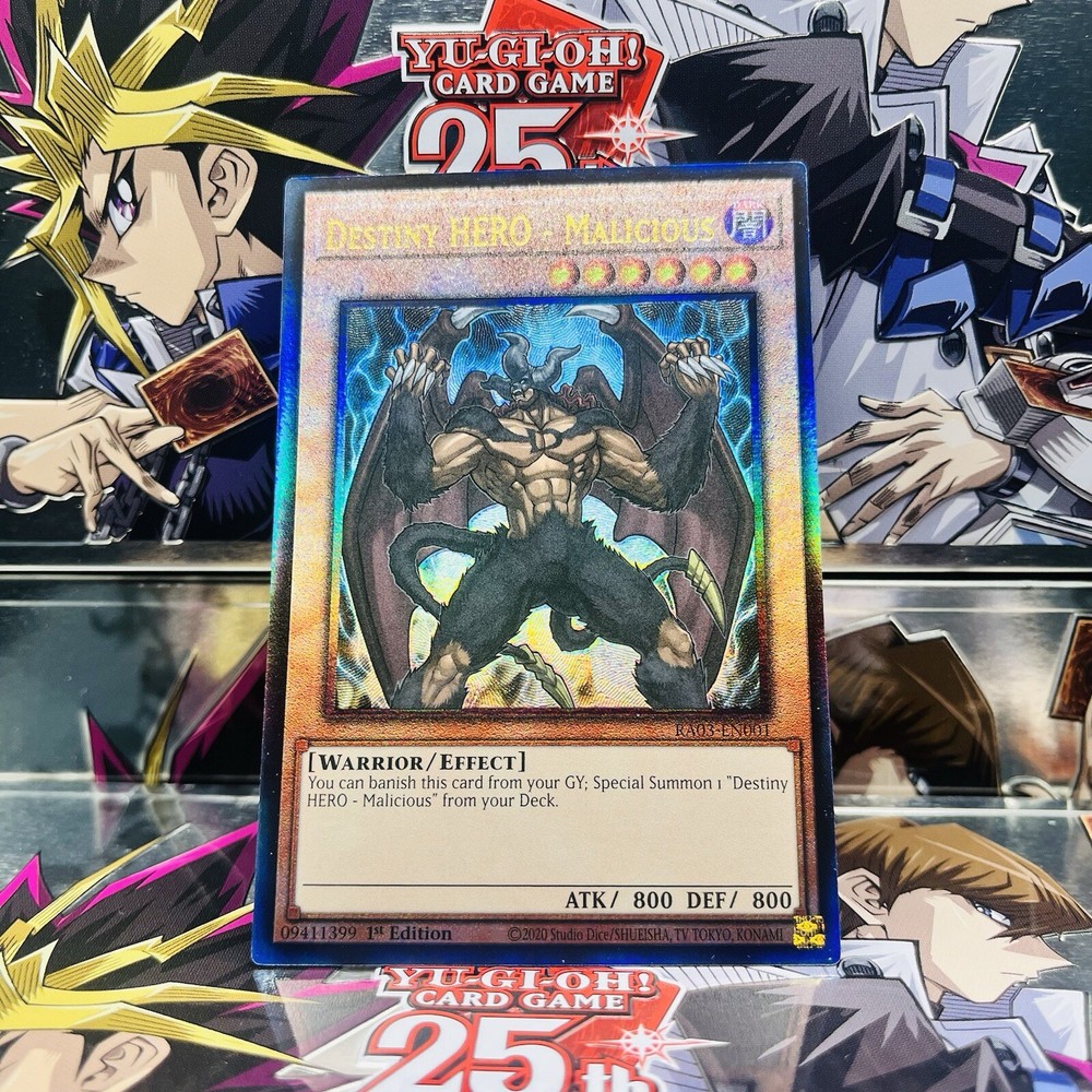 *All orders are packaged and shipped within 24 hours of payment. *All cards are pack fresh. Never played. Never used. *All cards are shipped in top loaders, penny sleeves, and team bags. All guaranteed! Or your money back! You are purchasing 1x authentic Yugioh Destiny HERO - Malicious RA03-EN001 Prismatic Ultimate Rare (Textured) 1st Ed in Near Mint condition. What to Expect: Fast Shipping: All orders are shipped within 24 hours of completed payment. Top Tier Quality: All cards are pulled straight from packs and immediately sleeved (Near Mint with no visible creases, dents, or scratches). Secure Packaging: All orders are tracked and packaged with Top Loaders, Penny Sleeves, and Team Bags for maximum protection. Returns: I accept returns within 30 days if the card arrives in a condition other than described. Buyer pays return shipping. Please, if you have any questions, comments, or concerns, reach out and I will be happy to assist you! Good luck with your deck/collection! Take care, Forbidden One YGO