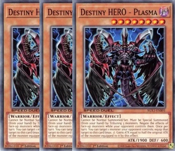 Destiny HERO - Plasma x 3 1st Edition The cards are in NM condition. Cards will be placed in a sleeve and top loader for security. Also will include a free Holographic card which can be Super, Ultra, Secret, etc! Card Information SGX1-ENB01 - 1st Edition Speed Duel GX: Duel Academy Box