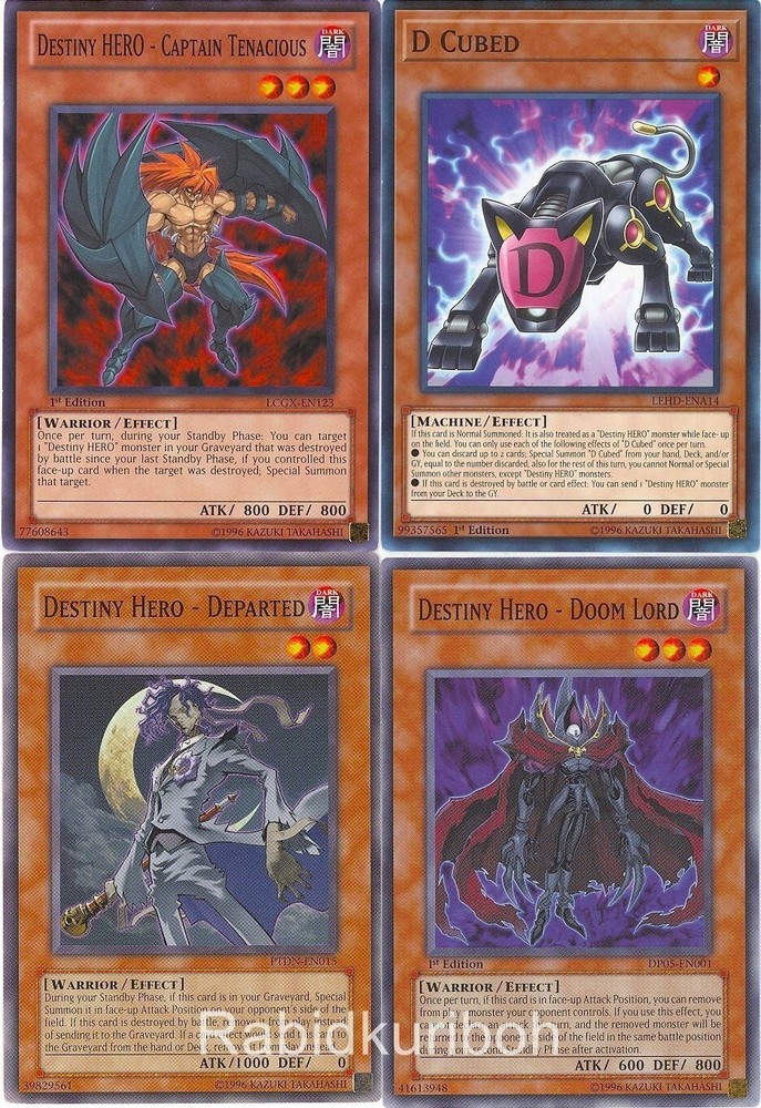 Selling what's listed below. Cards are in near mint or better condition unless specified below. The card(s) edition (1st, unlimited, limited) may be different from what is pictured. If this is important to you, please message me before buying so I can verify. Destiny HERO - Doom Lord - DP05-EN001 - Common Destiny HERO - Departed - PTDN-EN015 - Common Destiny HERO - Captain Tenacious - LCGX-EN123 - Common D Cubed - LEHD-ENA14 - Common Shipping is by USPS. Cards are shipped safely in a top loader.
