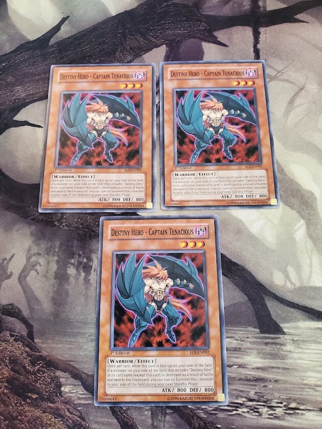 Free eBay listing template designed by dewiso.com Yugioh - Destiny Hero - Captain Tenacious EOJ-EN002 NM 1st ed Common x3 Product This a Yugioh Product that is being sold! Condition is exactly as pointed out in title. For you're reference: NM: Near Mint VLP: Very Lightly Played LP: Lightly Played MP: Moderately Played HP: Heavily Played Shipping This listing will be shipped via card sleeve/penny sleeve and a top loader via letter mail. If you are purchasing an order of over $150 I will provide shipping with tracking free! Contact If you have any questions whether it be more pictures of the back or clarification on an order please contact me! We will do everything to Help! Also if you have multiple items or even have specific things you are looking for, reach out and we might just have it! There are no refunds, items are final sale! If the item has been incorrectly described or wrongly sent, please send images and we will sort it out right away! If the product has X2 or X3, it means it will either come with 2 of the same card or 3 of the same card. Be sure to always check the title of the listing! Great quality products that we ship across North America! Be sure to leave a review when you receive the item! Collection and Bulk Pokemon/Yugioh Purchases If you have any collections or bulk cards that you wish to sell please contact me and send pictures of what you're looking to sell! Rates: Contact me for rates! Reminder: I am looking to make profit when buying and selling, so please when reaching out realize that we both have to profit off the transaction!