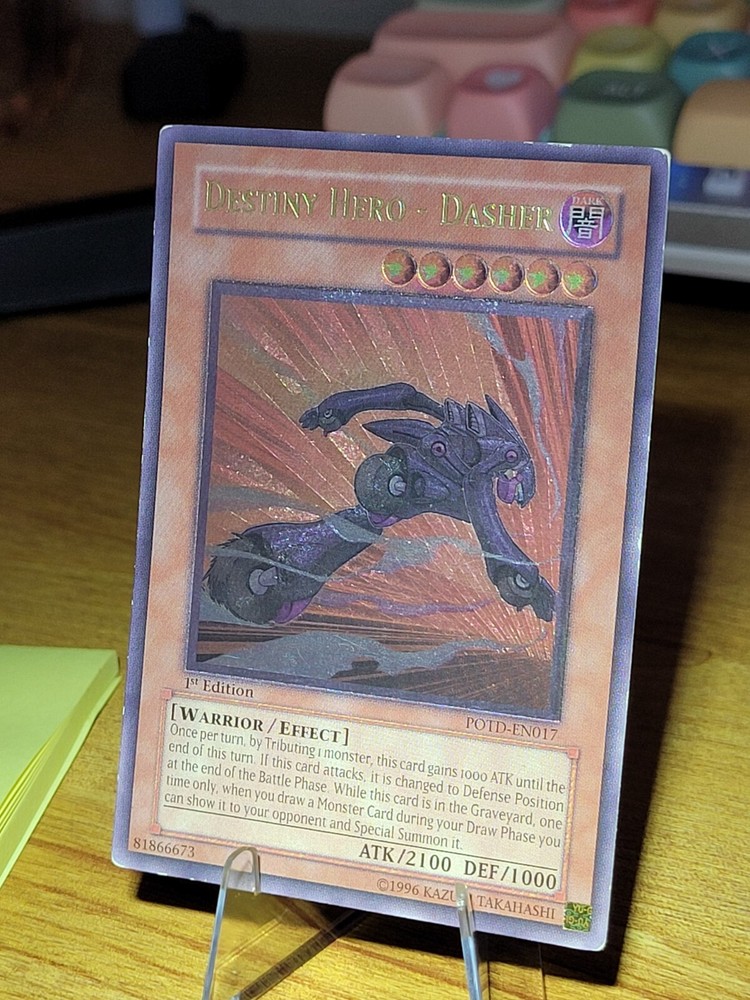 Selling Yugioh Card: Destiny Hero - Dasher (POTD-EN017), Ultimate Rare rarity, 1st Edition, VLP condition (please reference the photos as I am not an expert or a card grader). Super fast and secure shipping provided, shipping guaranteed within 2 business days of purchase! I want you to purchase with confidence, so please feel free to contact me with any questions regarding the cards. Check out my other listings for more Yugioh cards at fair prices.