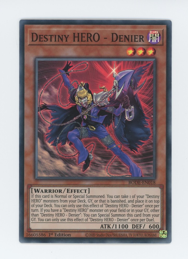 Yugioh Destiny Hero - Denier BODE-EN018 1st Edition Super Rare x3 Play Set You can find more Yu-Gi-Oh cards of all value and rarity in our other listings All cards are in excellent condition unless stated otherwise and the photos are of cards we own but may not be the exact card you receive due to the quantities listed.