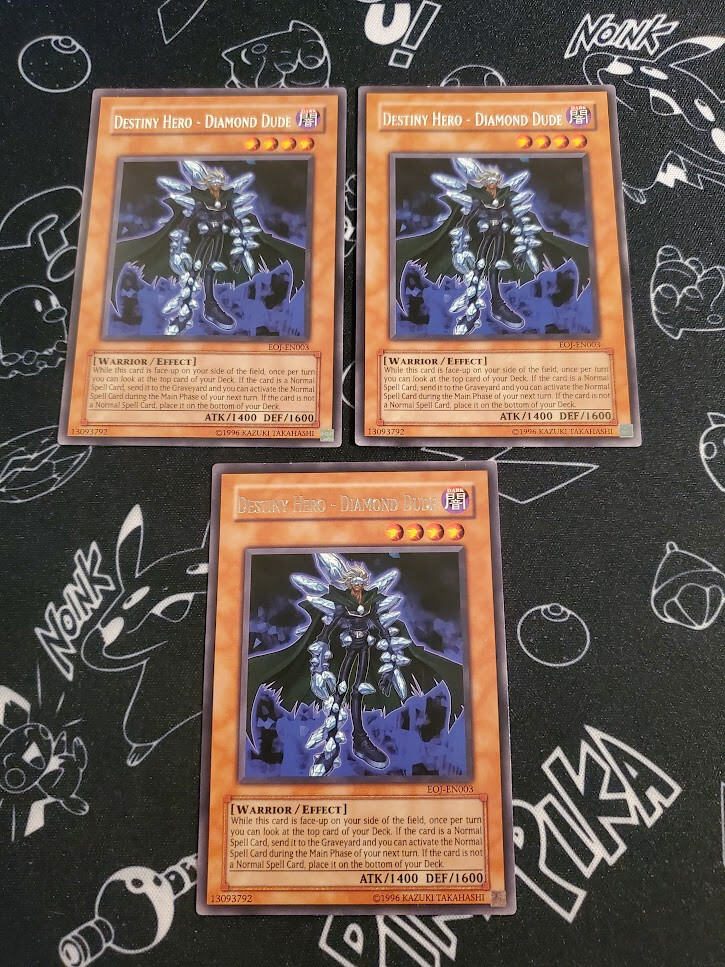 Free eBay listing template designed by dewiso.com Yugioh - Destiny Hero - Diamond Dude EOJ-EN003 NM Unlimited Rare x3 Product This a Yugioh Product that is being sold! Condition is exactly as pointed out in title. For you're reference: NM: Near Mint VLP: Very Lightly Played LP: Lightly Played MP: Moderately Played HP: Heavily Played Shipping This listing will be shipped via card sleeve/penny sleeve and a top loader via letter mail. If you are purchasing an order of over $150 I will provide shipping with tracking free! Contact If you have any questions whether it be more pictures of the back or clarification on an order please contact me! We will do everything to Help! Also if you have multiple items or even have specific things you are looking for, reach out and we might just have it! There are no refunds, items are final sale! If the item has been incorrectly described or wrongly sent, please send images and we will sort it out right away! If the product has X2 or X3, it means it will either come with 2 of the same card or 3 of the same card. Be sure to always check the title of the listing! Great quality products that we ship across North America! Be sure to leave a review when you receive the item! Collection and Bulk Pokemon/Yugioh Purchases If you have any collections or bulk cards that you wish to sell please contact me and send pictures of what you're looking to sell! Rates: Contact me for rates! Reminder: I am looking to make profit when buying and selling, so please when reaching out realize that we both have to profit off the transaction!