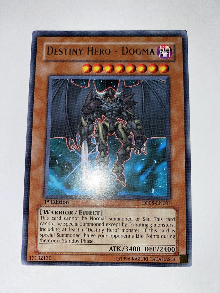 Yugioh! Destiny Hero - Dogma DP05-EN007 1st Edition Rare NM. Calculated Shipping Rate: 1 oz. = $.53, 2 oz. = $.73, 3 oz. = $.93 on Combined orders UNDER $5.00. FREE SHIPPING ON ALL ORDERS OVER $5.00. Orders Under $20 are Shipped in an Envelope in Hard Plastic Top Loader with Tracking. Orders Over $20 are Shipped in Bubble Mailer in Hard Plastic Top Loader with Tracking.