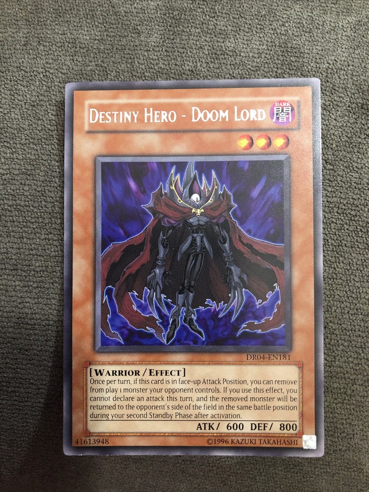 You are purchasing one Near Mint copy of Yugioh Destiny Hero - Doom Lord Rare DR04-EN181. Card will be shipped 2-3 days after payment is made