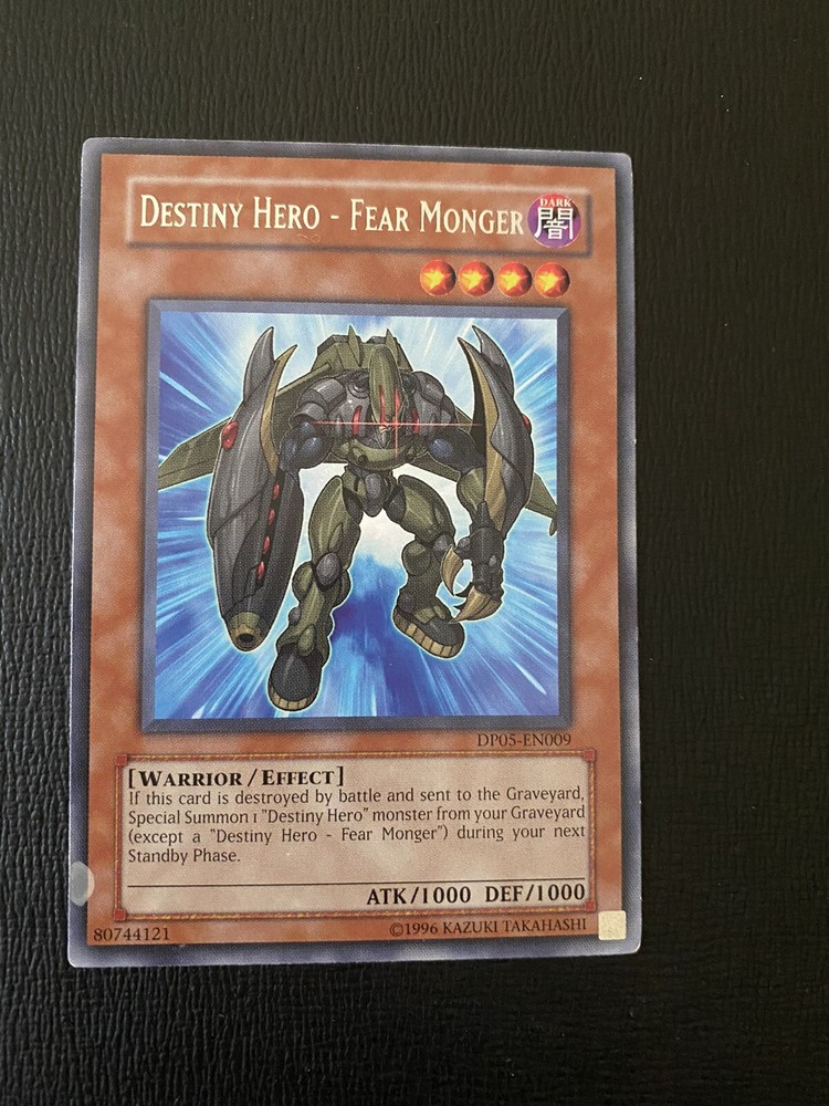 Yugioh: Destiny Hero - Fear Monger - DP05-EN009 - Rare - Unlimited. Duelist pack - Aster Phoenix. Lightly played. White circle stain near bottom left....