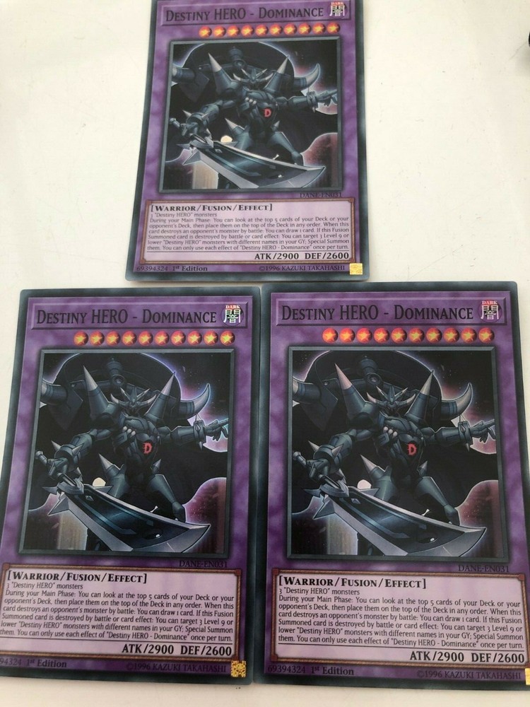 Yugioh Destiny Hero-Dominance DANE-EN031 Super Rare Mint Condition x3 You can find more Yu-Gi-Oh cards of all value and rarity in our other listings All cards are in excellent condition unless stated otherwise and the photos are of cards we own but may not be the exact card you receive due to the quantities listed.